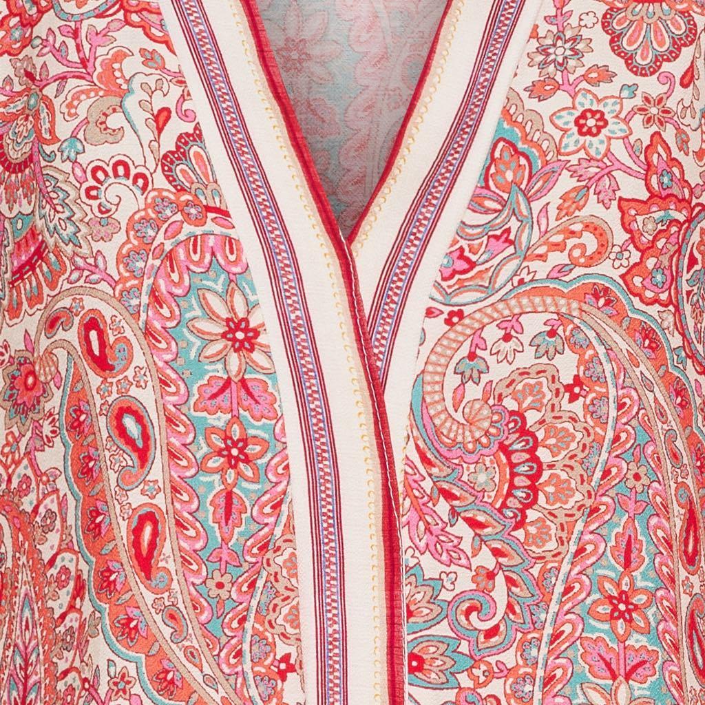 Nydelig V-hals og vide ermer til albuenn. Vakkert kantbånd i hals og på ermer. Kjolen skrår lett.