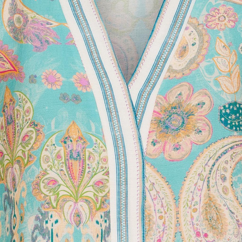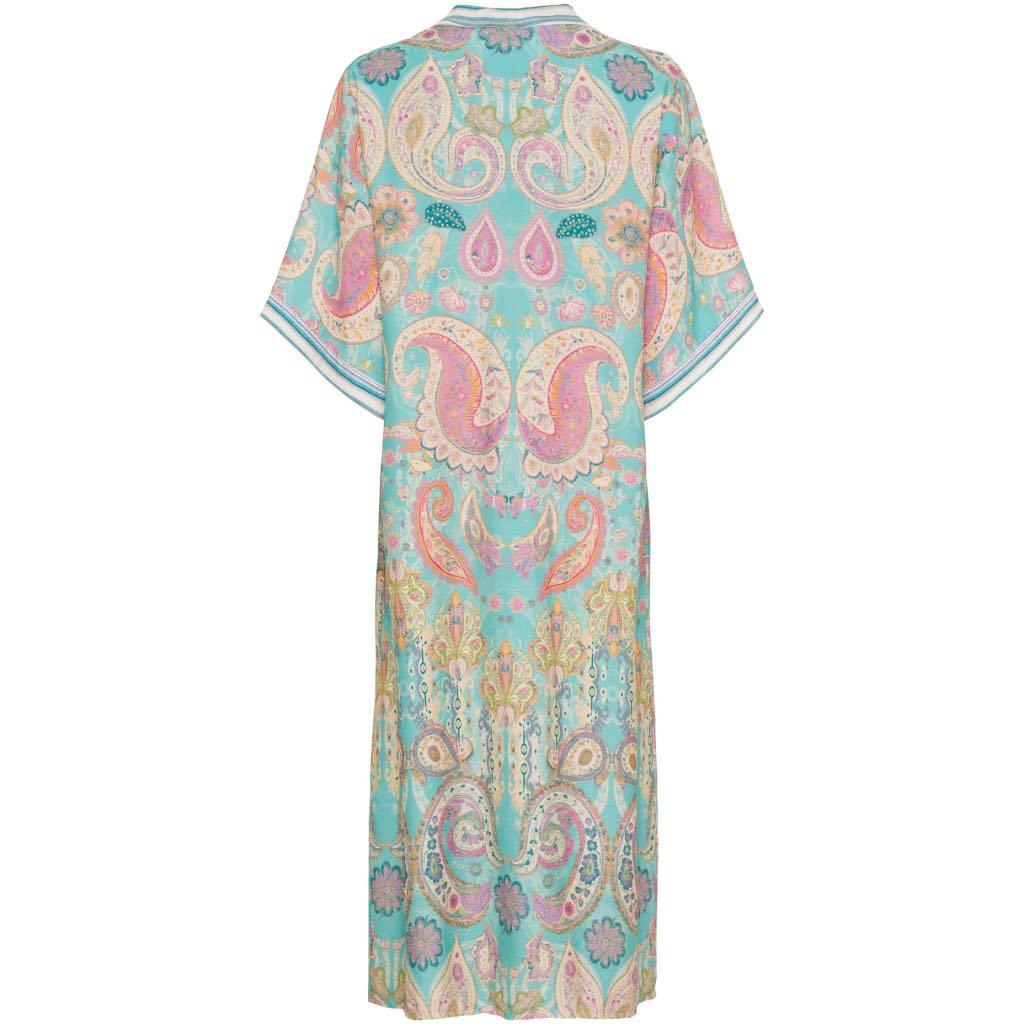 Nydelig V-hals og vide ermer til albuenn. Vakkert kantbånd i hals og på ermer. Kjolen skrår lett.