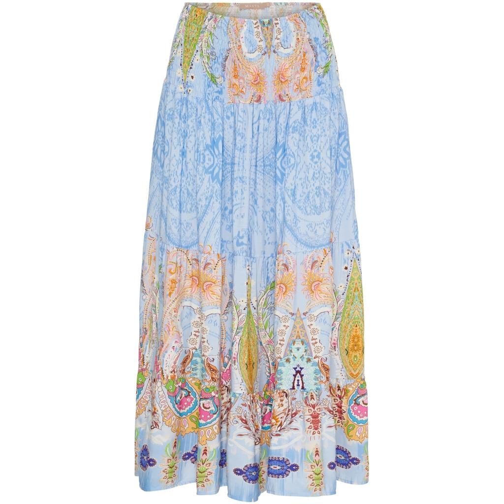 Lekkert kappeskjørt med bred vaffelstrikk i livet. Herlig mønster og farger.