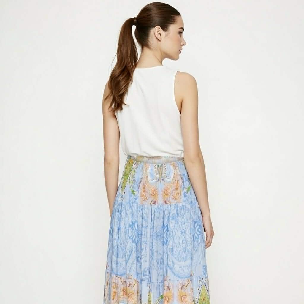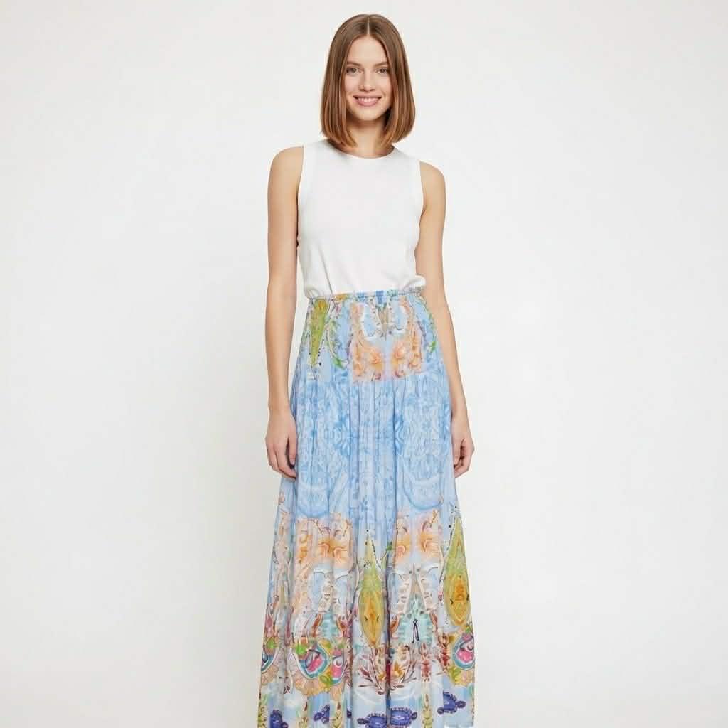 Lekkert kappeskjørt med bred vaffelstrikk i livet. Herlig mønster og farger.