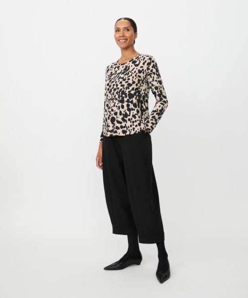 Disse buksene er definisjonen på avslappet eleganse. De er laget i et mykt stoff med en flatterende lengde rett under kneet og har en elegant, tettsittende passform i midjen, fremhevet av en elastisk linning bak. De brede, lett avsmalnende bena faller mykt og skaper en moderne silhuett med mye komfort. Buksene er designet med diskrete passepoilerte lommer i sidene, paspolerte baklommer, og lukkes elegant med en skjult glidelås på siden. Style dem med alt fra en enkel T-skjorte til en feminin topp, avhengig av anledningen.