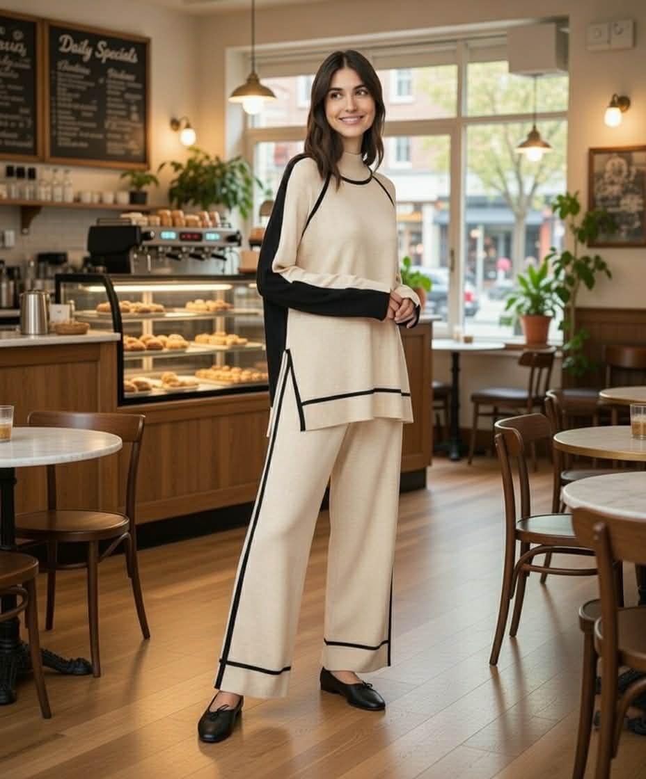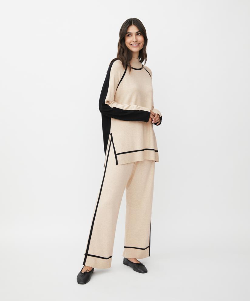 Aldri har noe så mykt også vært så stilfullt. Disse buksene er strikket i en lett kvalitet som føles florlett mot huden. Med strikk i midjen og en avslappet passform er de en drøm å ha på, mens de smale svarte stripene gir antrekket en ekstra touch.