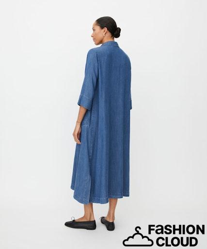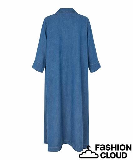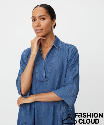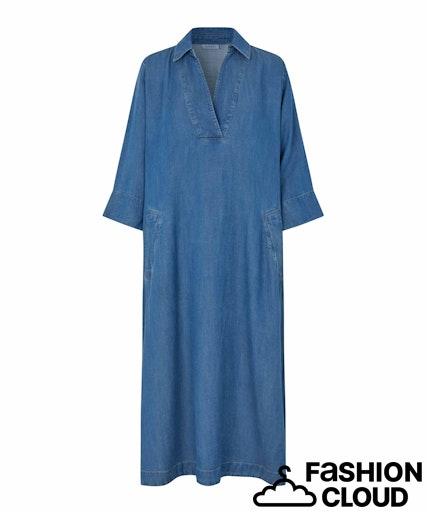 Denne modellen er en kjole-favoritt! Denne kjolen kombinerer det beste av to verdener – et løst og ledig snitt som gir komfort og bevegelsesfrihet, og et mer definert uttrykk over skuldrene som gir struktur og stil. V-halsen med krage gir et sofistikert preg, og de deilige lommene gjør den både praktisk og anvendelig. 3/4 ermer med liten splitt i mansjetten gir en fin avslutning. Det løse snittet er behagelig å bevege seg i, mens de definerte skuldrene gir kjolen struktur.