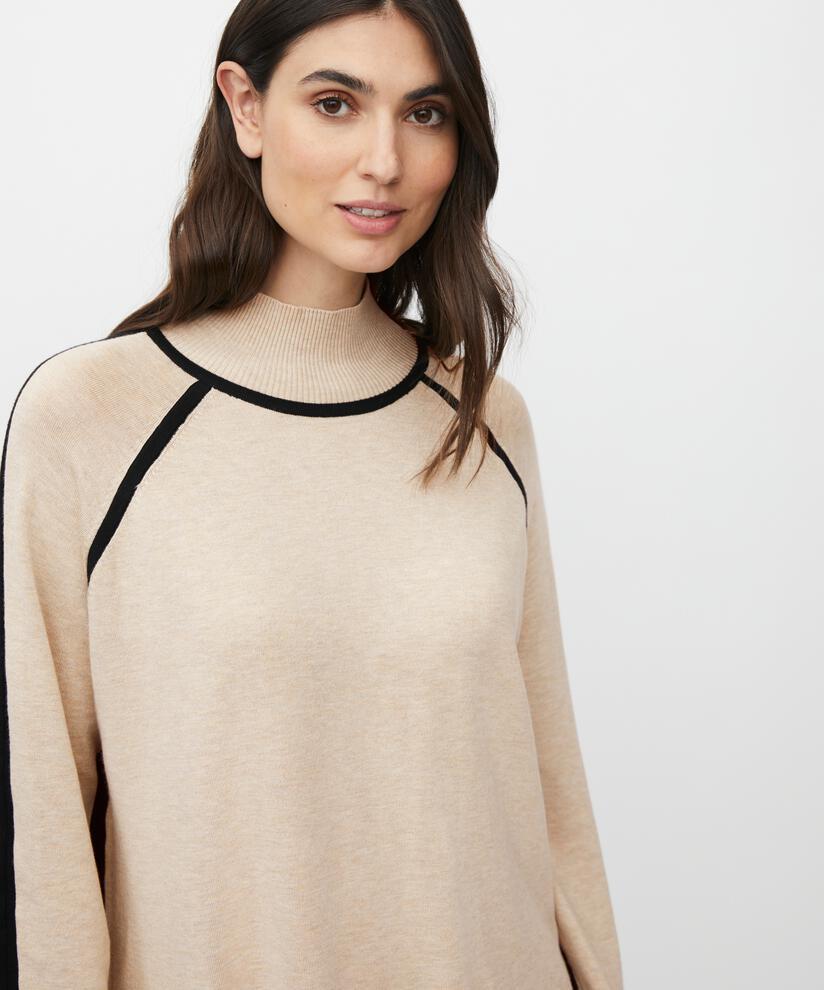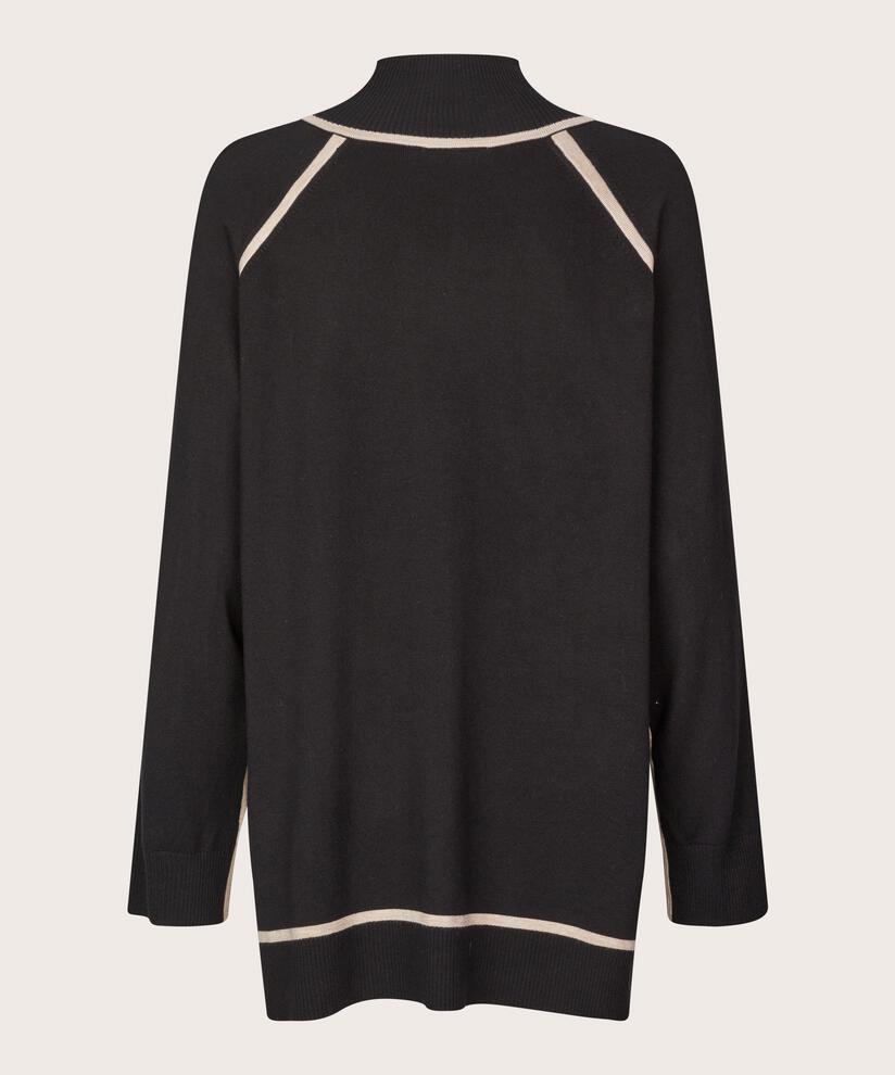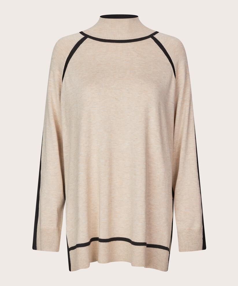 De beste klærne er de du føler deg vel i – og denne strikken leverer på alle fronter. Den er lett, myk og deilig å ha på seg. Designet er enkelt og stilfullt med en høy ribbestrikket hals, lange ermer, høye splitter i sidene og sorte kontrastdetaljer som fremhever silhuetten.