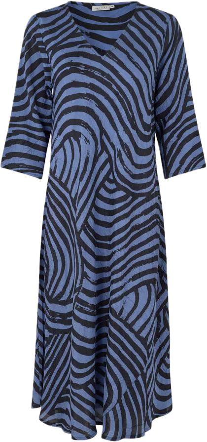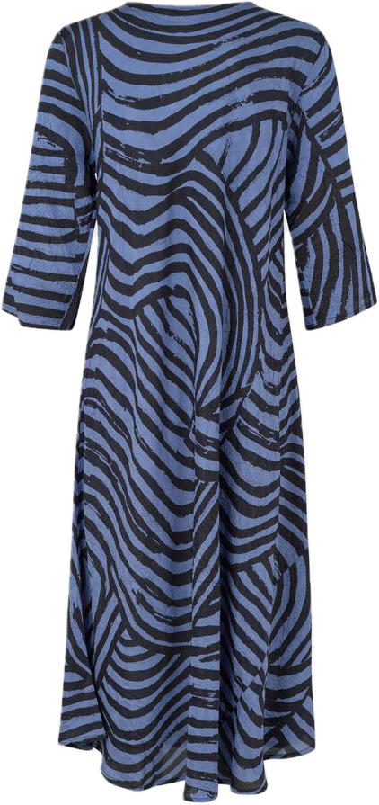 Stjel oppmerksomheten i denne vakre lyseblå kjolen med grafiske striper som utstråler selvtillit og stil. Kjolen er skåret i vårt populære bias-snitt, som smyger seg elegant inntil kroppen og fremhever figuren din på en flatterende måte. Den er full av feminine detaljer som V-utringningen, 3/4-ermer og en lett avrundet kant nederst.