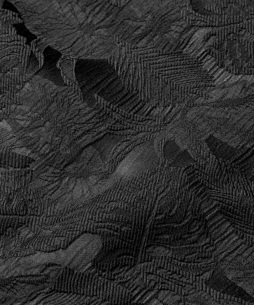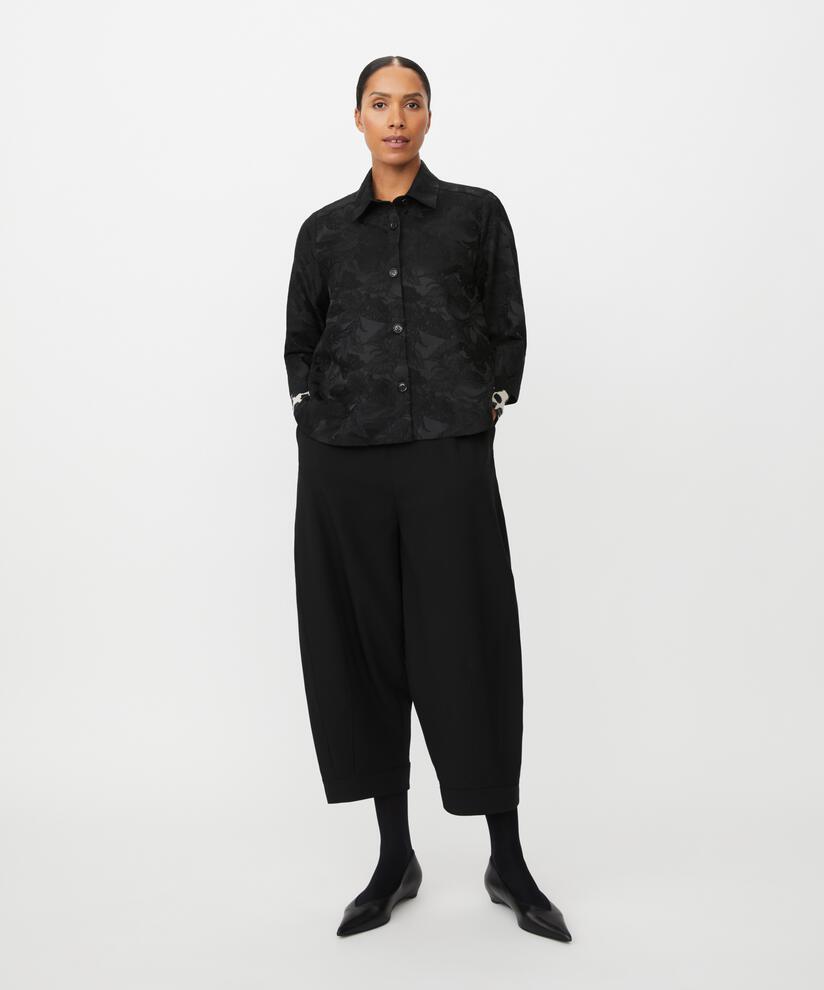 Gi antrekket ditt et elegant preg med denne svarte jakken. Det vevde blomstertrykket skaper et luksuriøst uttrykk, og jakken er allsidig nok til å passe til ethvert look. Med skjortekrage, vide 3/4-ermer og et feminin A-formet snitt faller den mykt og komfortabelt over kroppen. Bruk den lukket som en stilfull skjorte, eller la den være åpen som en lett jakke.