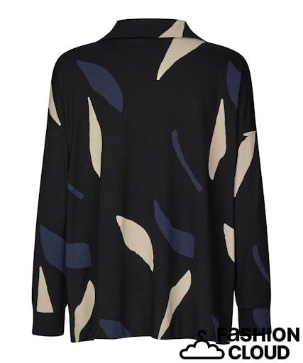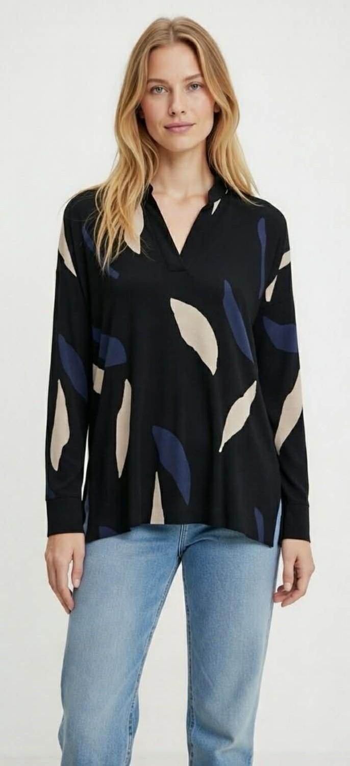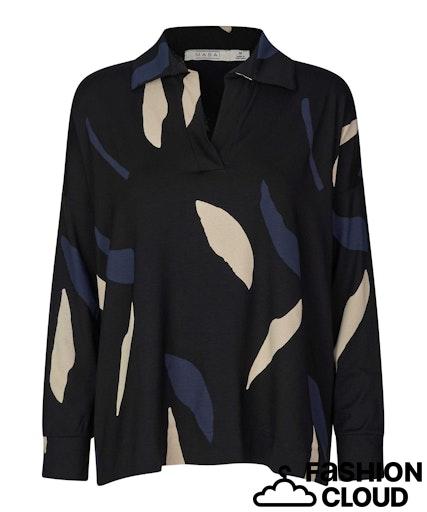 Deiliog og my skjortebluse fra Masai. Krage med V-hals. Splitt i sidene. Stretch. Rett modell. Sort bunnfarge