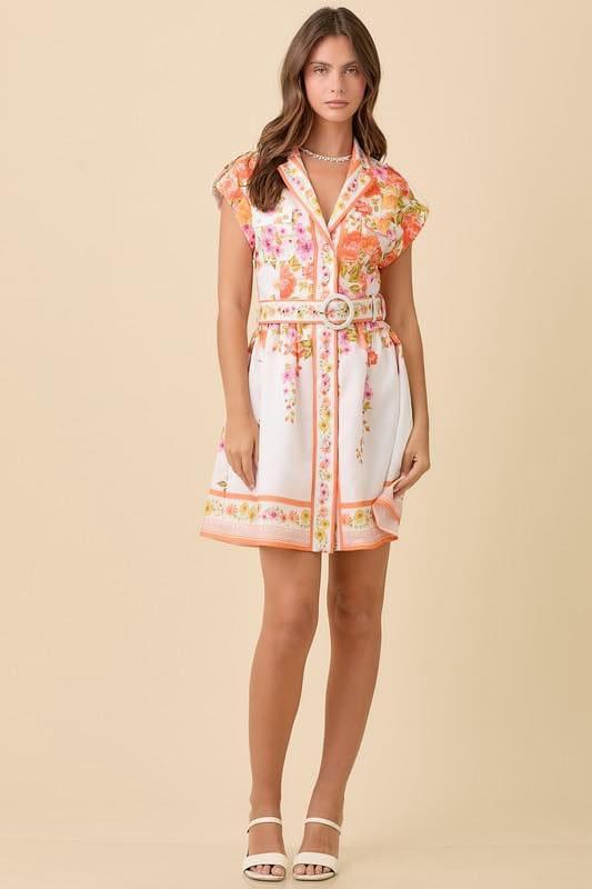 Sjekk denne lekre kjolen med oransje mønster. Retro-look og løst belte. Kjolen er litt liten i størrelsen.