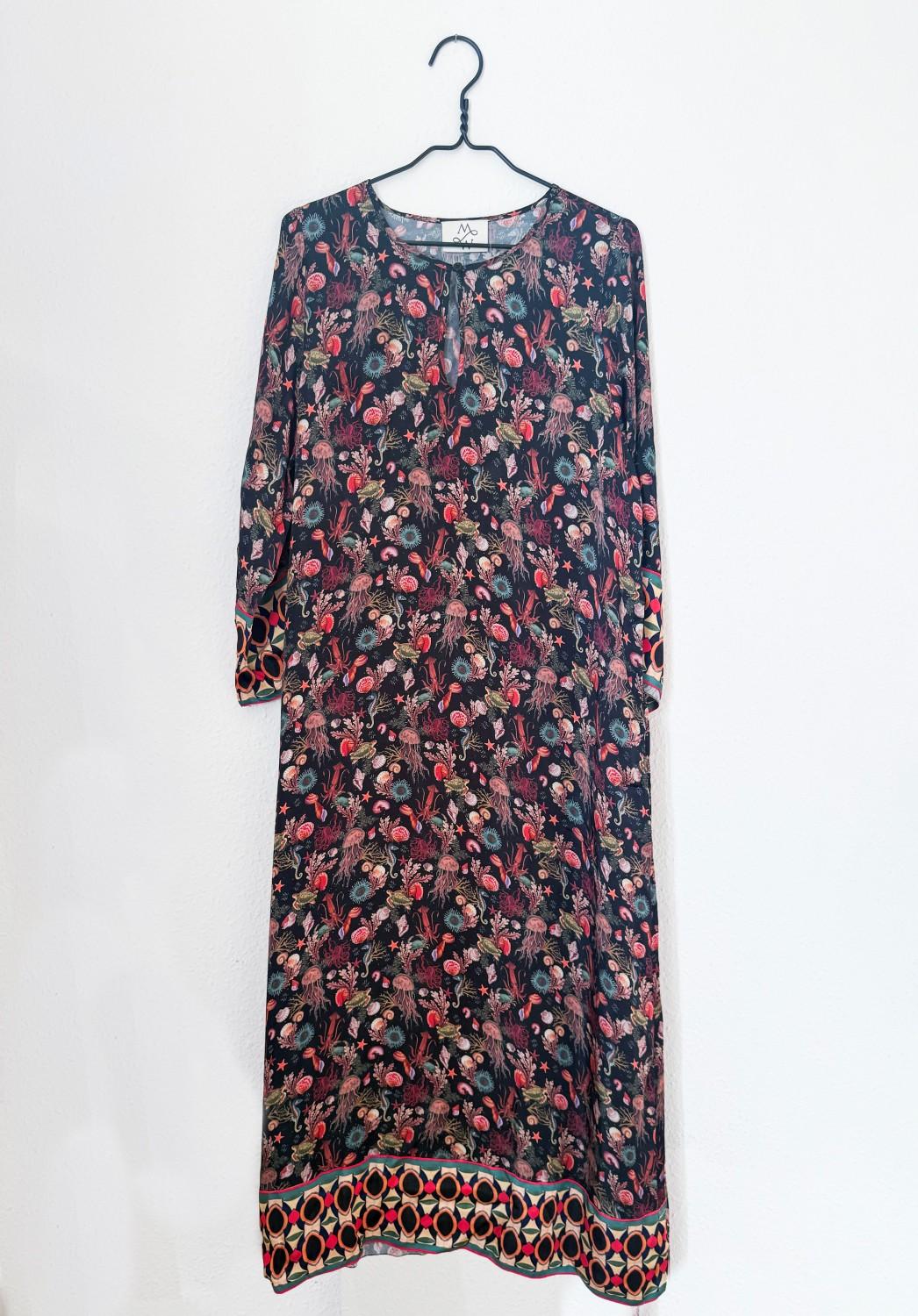 Den har rette ermer med et lekkert mønster nederst, v/hals med knapp øverst. Kjolen har en rett fasong og avsluttes med samme mønster som på erm nederst. En virkelig drøm av en kjole.