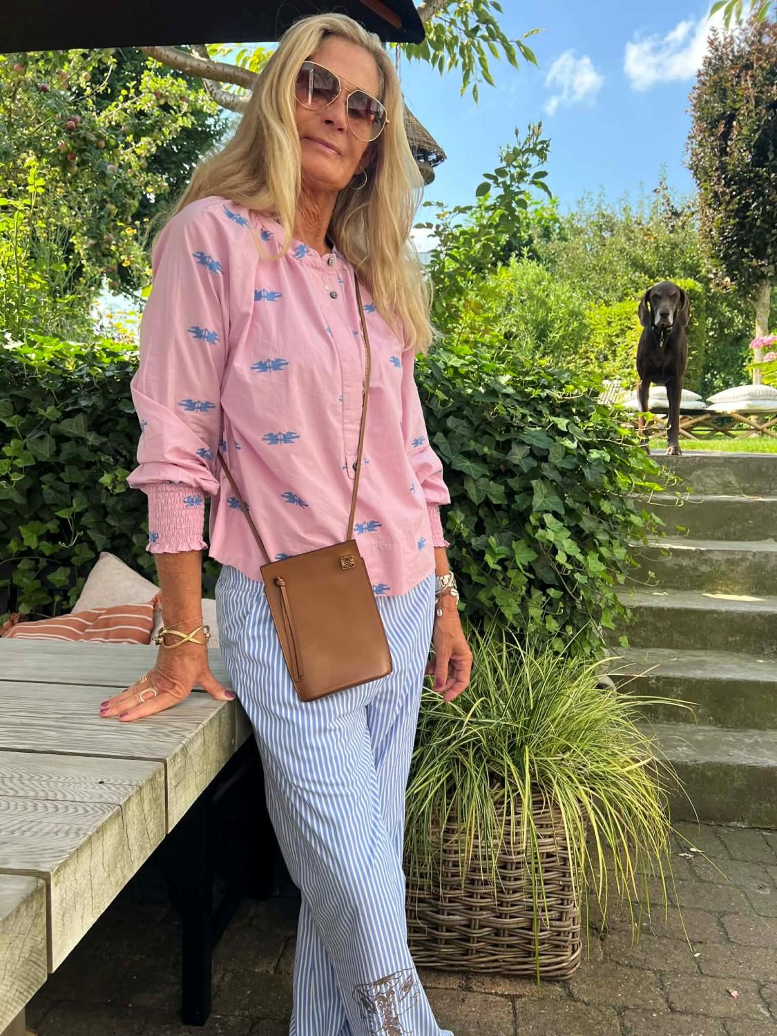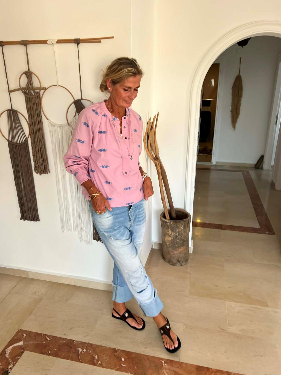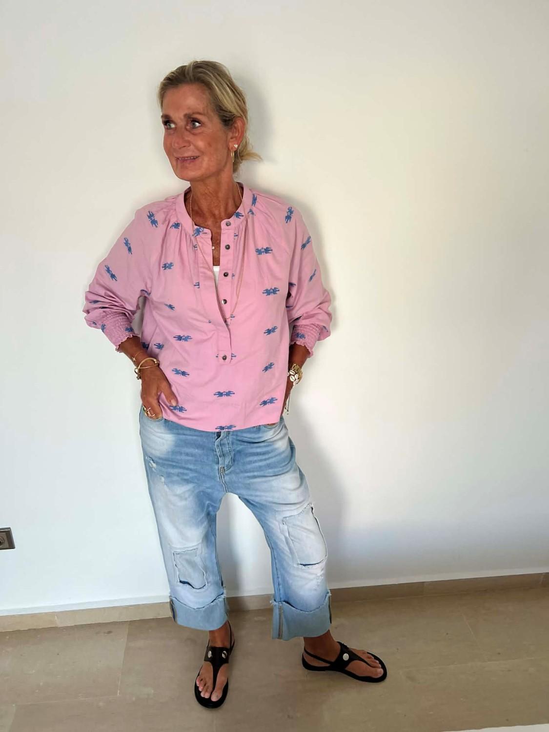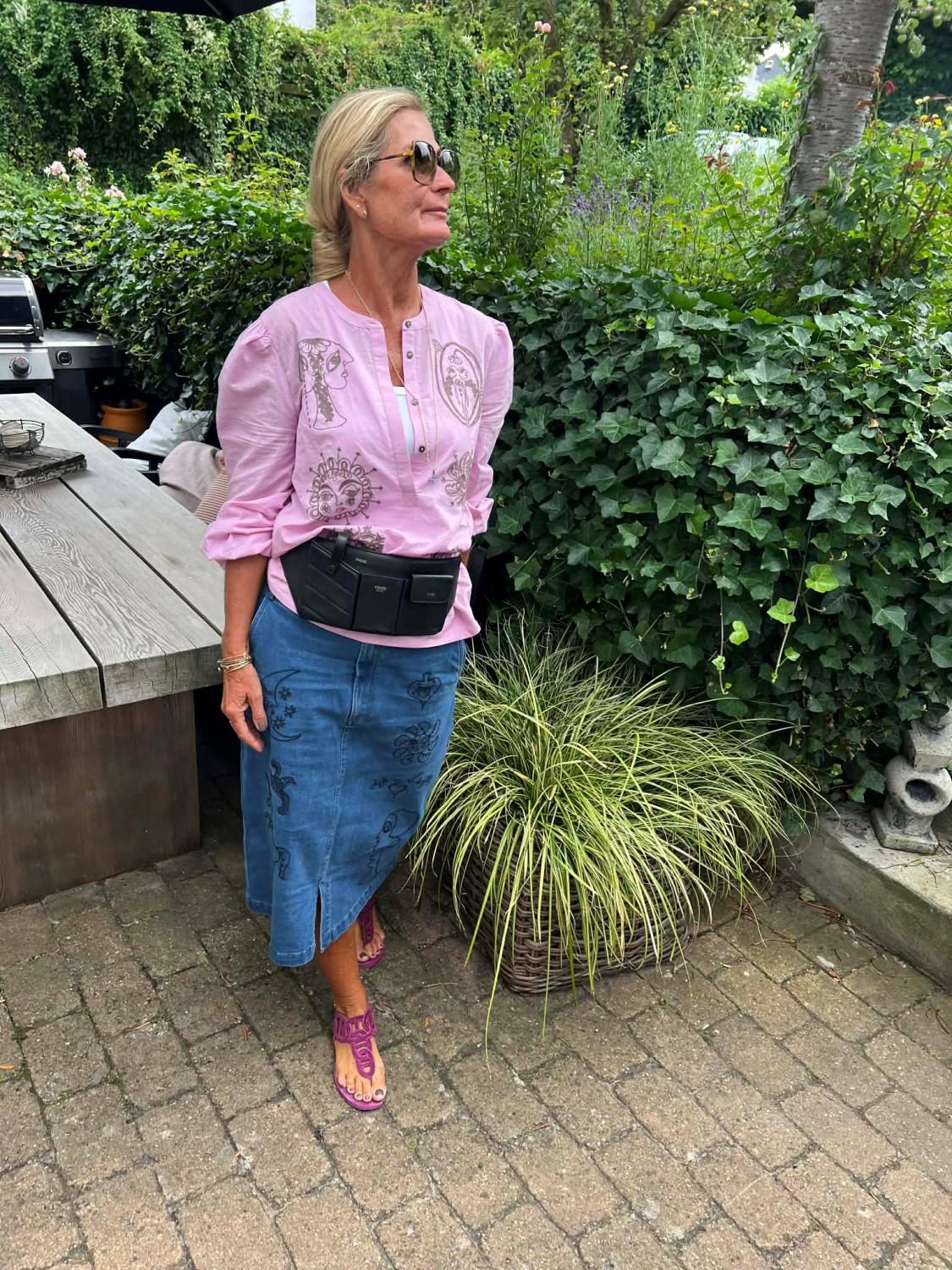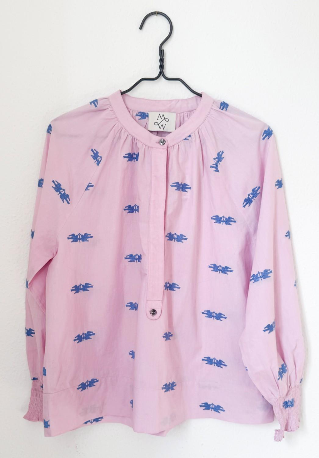 Tøff skjorte i lavendel med lekre broderier. Den har vide ermer med vaffelsøm nederst, skjult knapperekke i front.