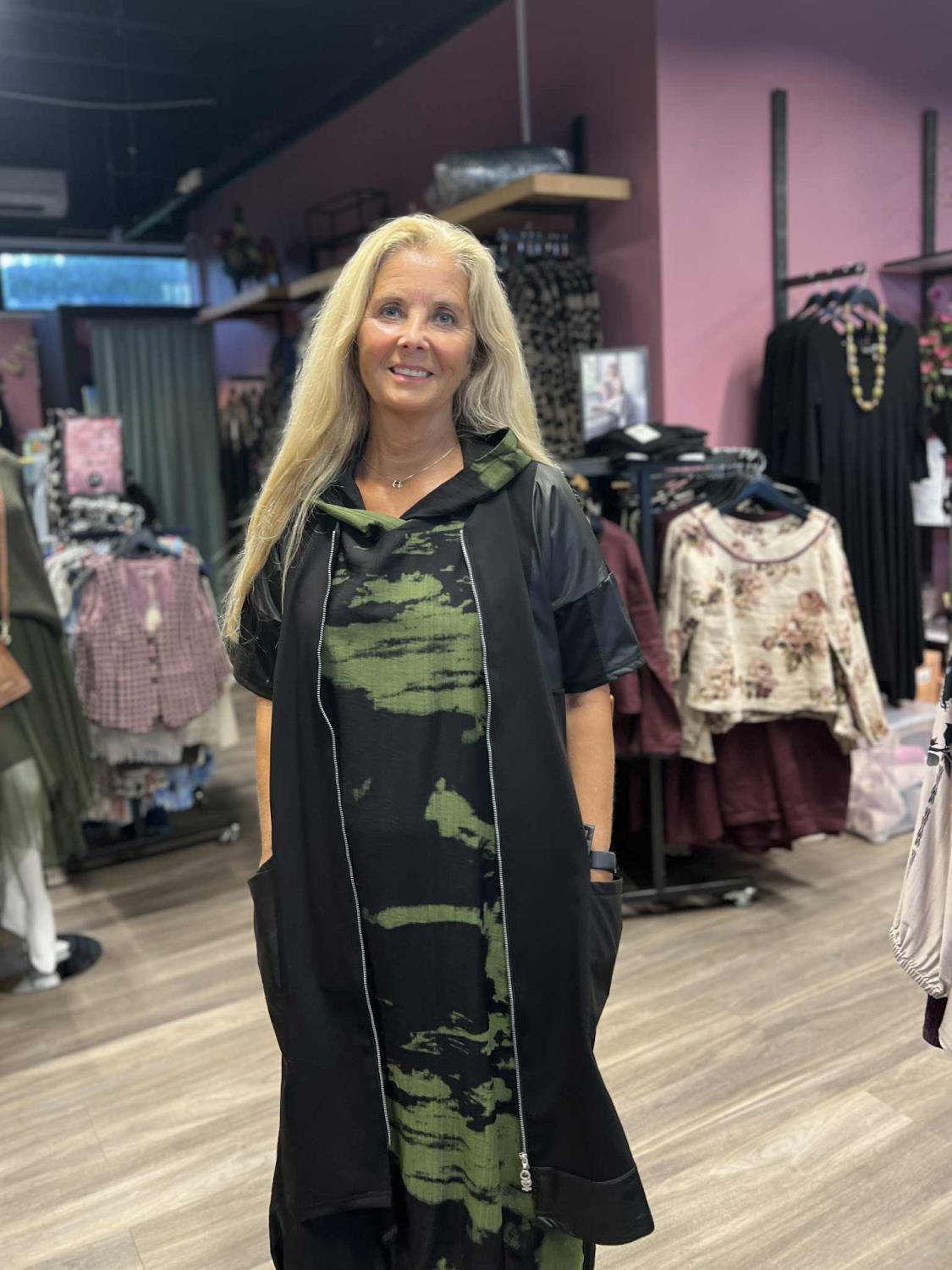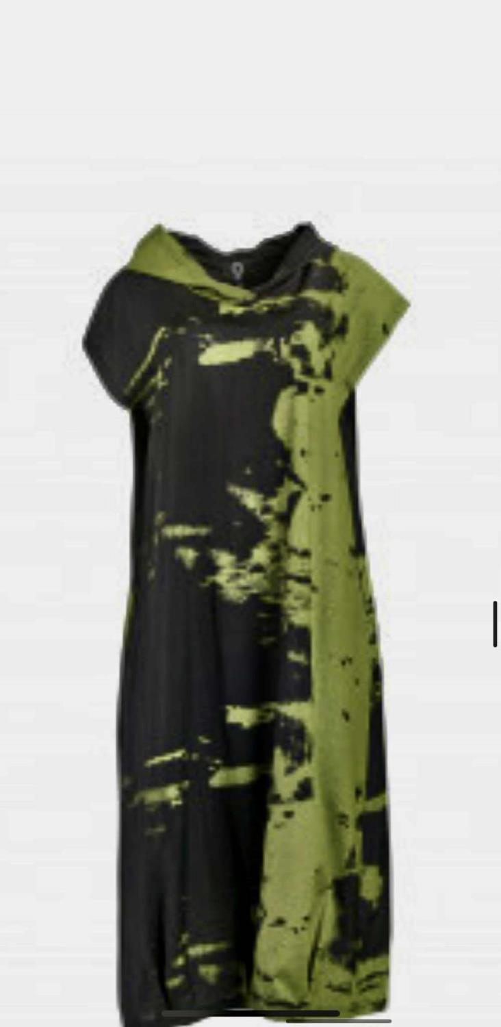 Tøff kjole m/hette i et lekkert grafisk mønster. Lommer i siden, tre legg nederst i front. Style den gjerne med et par boots for en rocka stil.