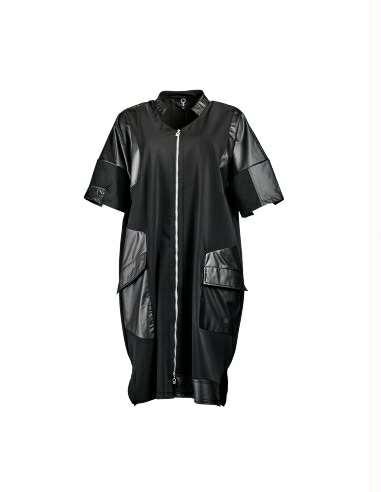 Lekker jakke som du også kan bruke som vest eller kjole. Den har skinnimitert stoff på skuldre og på de to store lommene med klaff i front. Felter med skinnimitert stoff bak samt en liten lomme. Skråskjæring i hver side nederst.