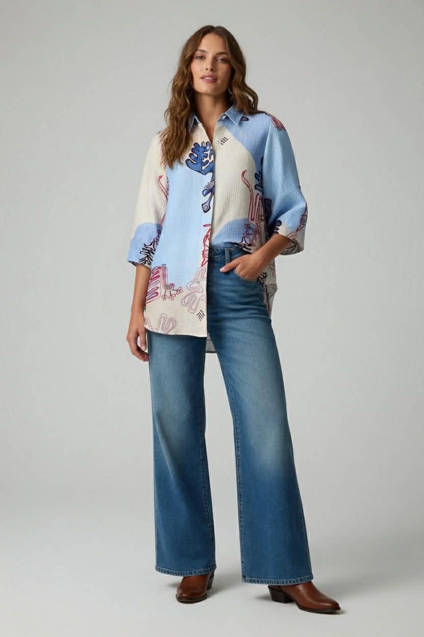 Skjorten har lange ermer med mansjetter og knappelukking, og føles avslappet, men likevel elegant.