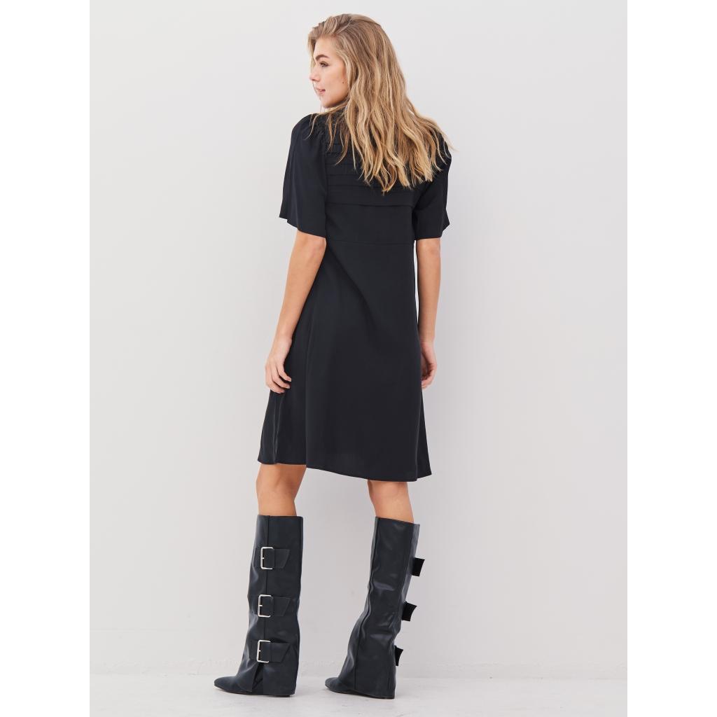 Denne kjolen har en feminin snitt med en lett A-linje og fine folder over brystet som skaper struktur og karakter. De korte, lett puffede ermene og den lille rysjekanten på halsen tilfører en romantisk touch, mens den fremre glidelåsen gir en praktisk detalj. Materialet faller mykt, noe som gir kjolen en avslappet eleganse som gjør den egnet for både hverdagsbruk og mer formelle anledninger.