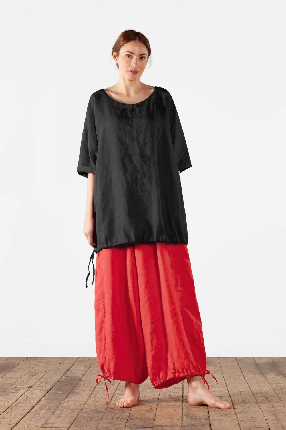 Kul bukse/bukseskjørt fra Olars Ulla med generøs passform. Kan snøres i beina. Strikk i livet med beltespenner. to lommer i siden og to lommer på siden av låret.