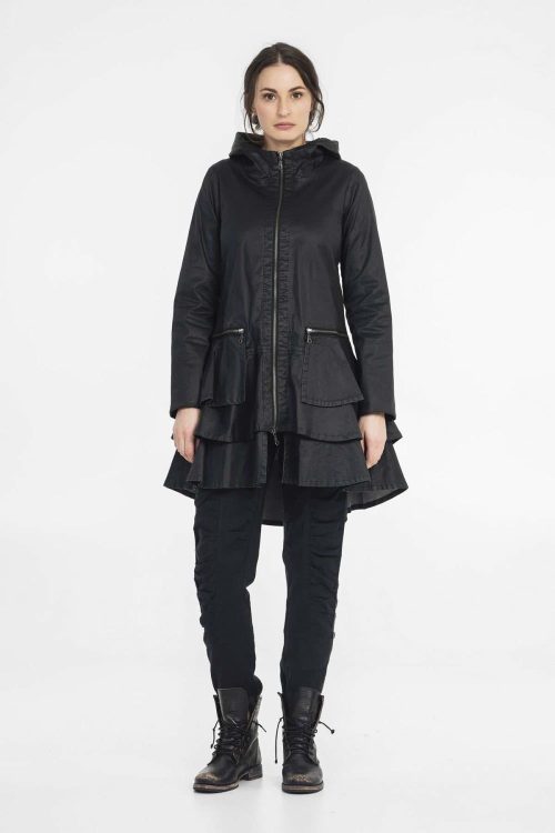 Helforet oilskin-jakke med feminint snitt. Satt inn med vannavvisende økologisk bivoks.