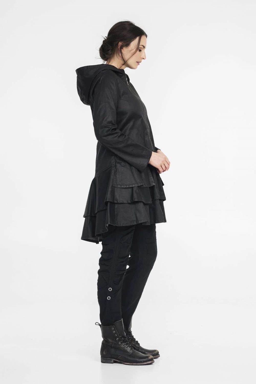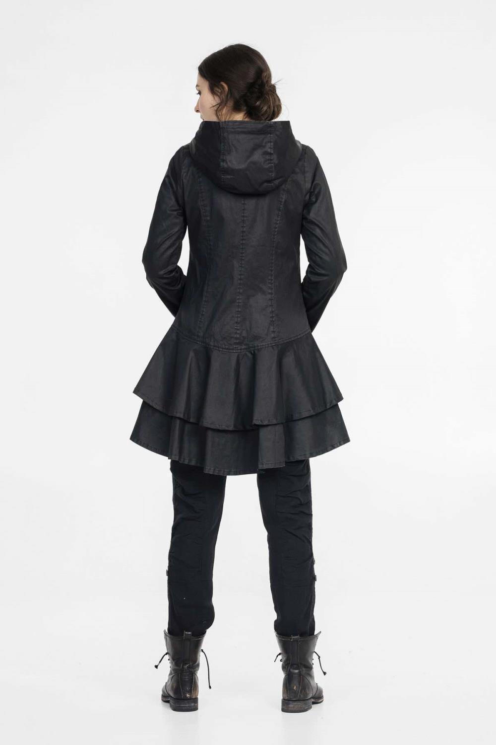 Helforet oilskin-jakke med feminint snitt. Satt inn med vannavvisende økologisk bivoks.