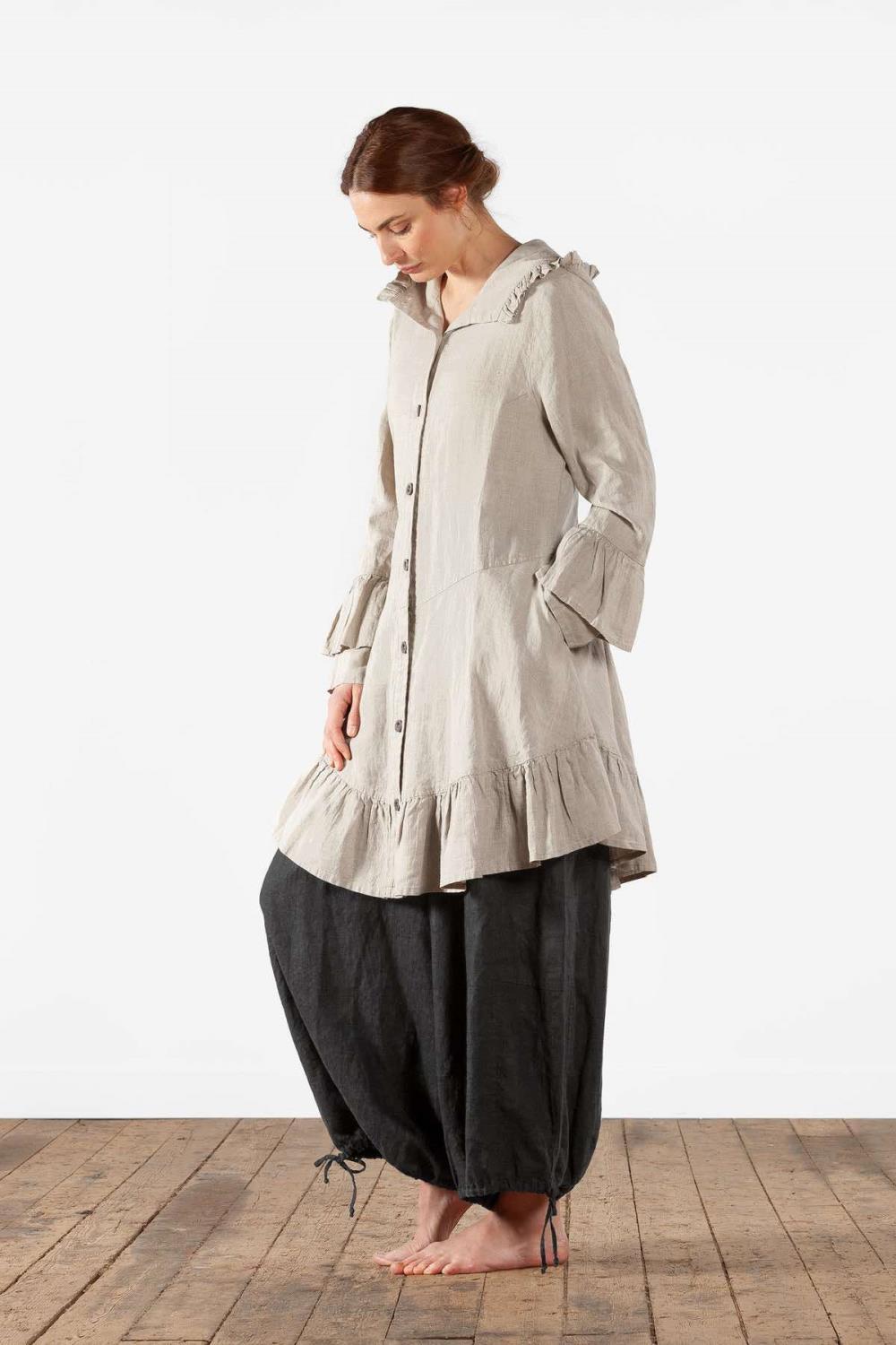 Den vakreste lange jakka fra Olars Ulla! Det er en lett innsvinget modell med rysjer rundt hette og volang nederst på ermene og nede. Jakka har en nydelig lavendelfarge.