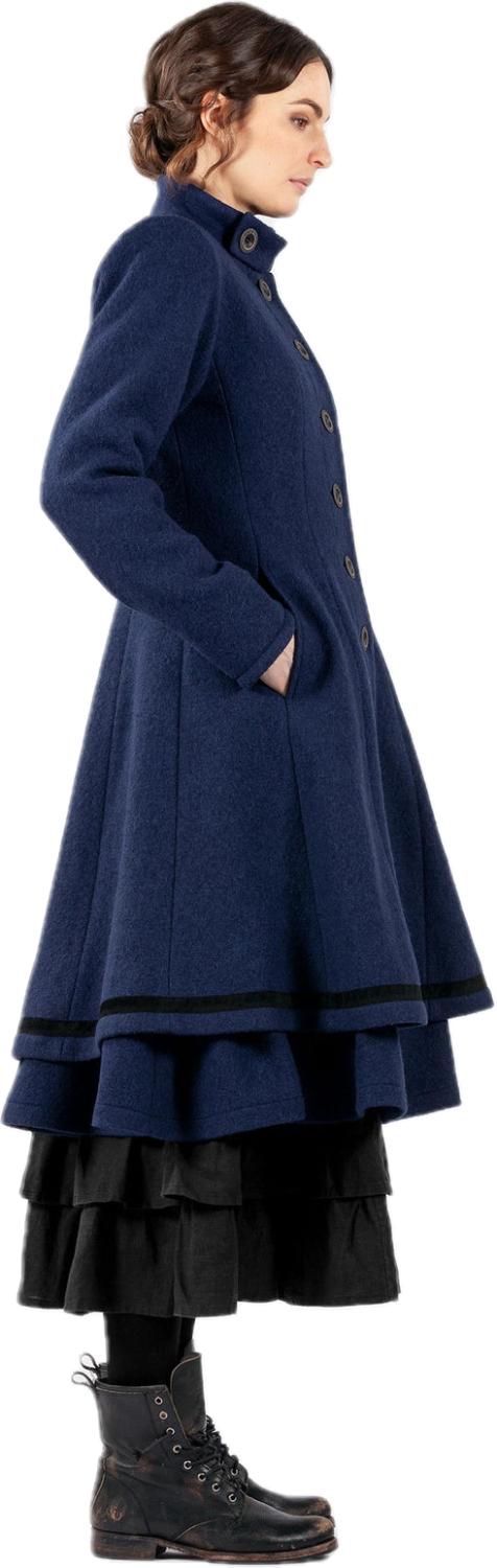 Kåpen er lett innsvinget og har en magisk underdel med vidde og vakre bånd. Høy hals med knepping og lommer i siden. Kåpen er helfòret og lukkes med knapper.