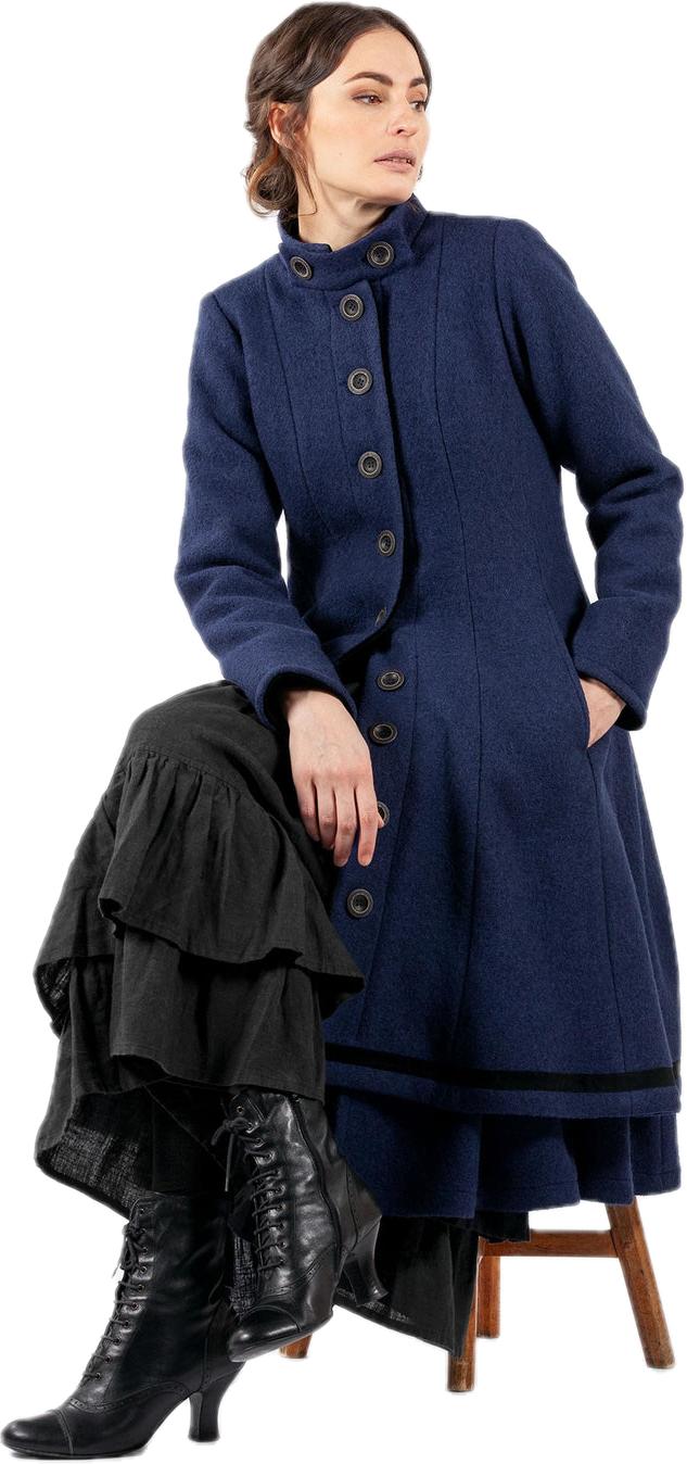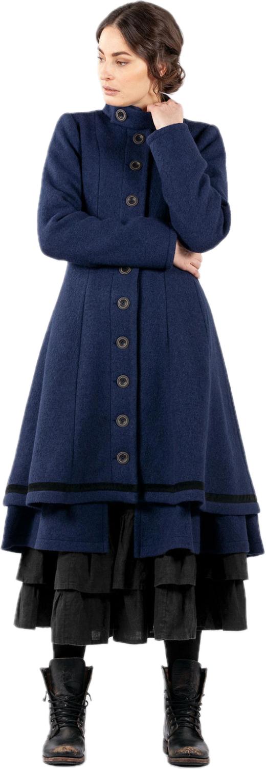 Kåpen er lett innsvinget og har en magisk underdel med vidde og vakre bånd. Høy hals med knepping og lommer i siden. Kåpen er helfòret og lukkes med knapper.