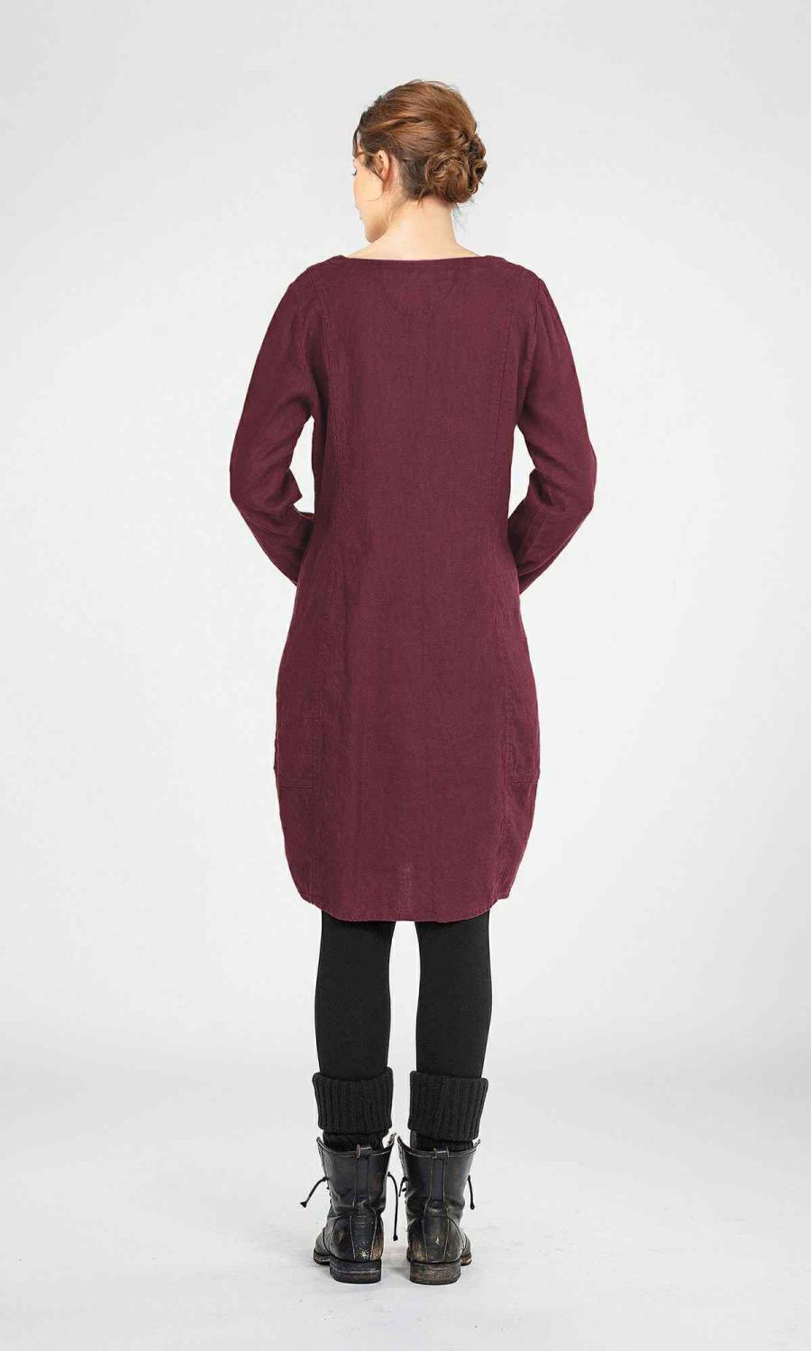Kjolen er enkel og fremhever figuren med en innsnevnt midje og en lett ballongfølelse. Lett utringet hals med knapper ned til sømmen i midjen. To stikklommer foran.