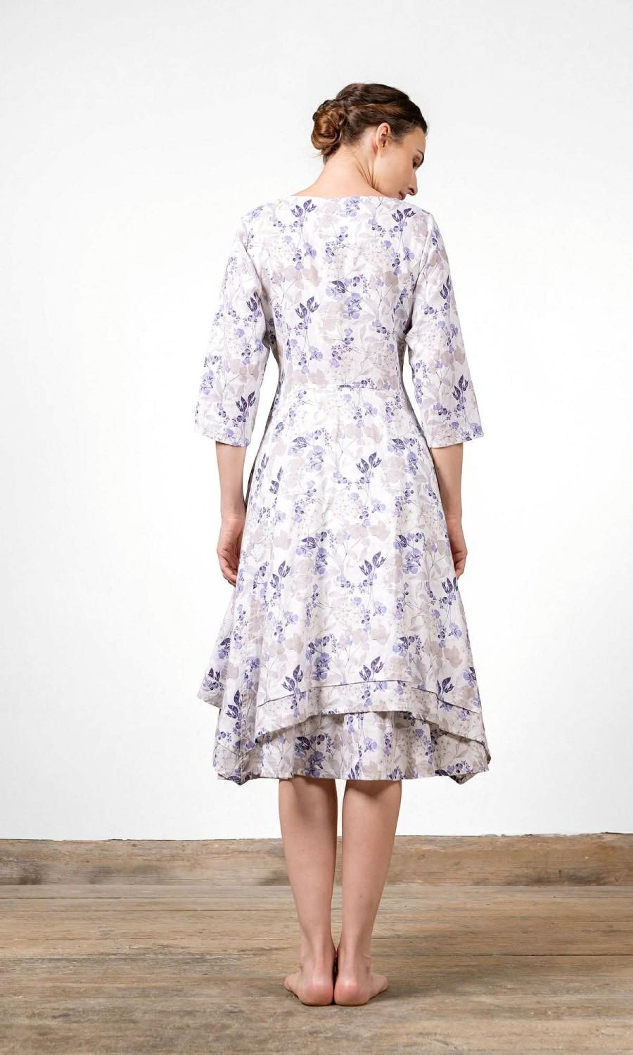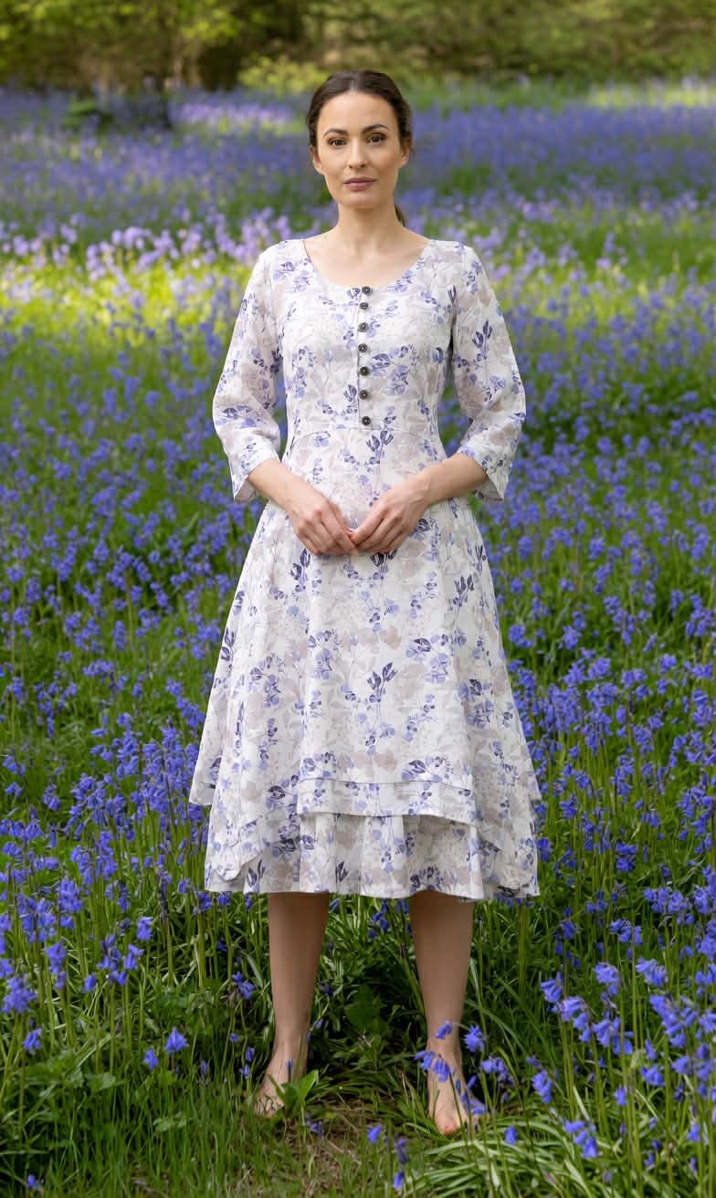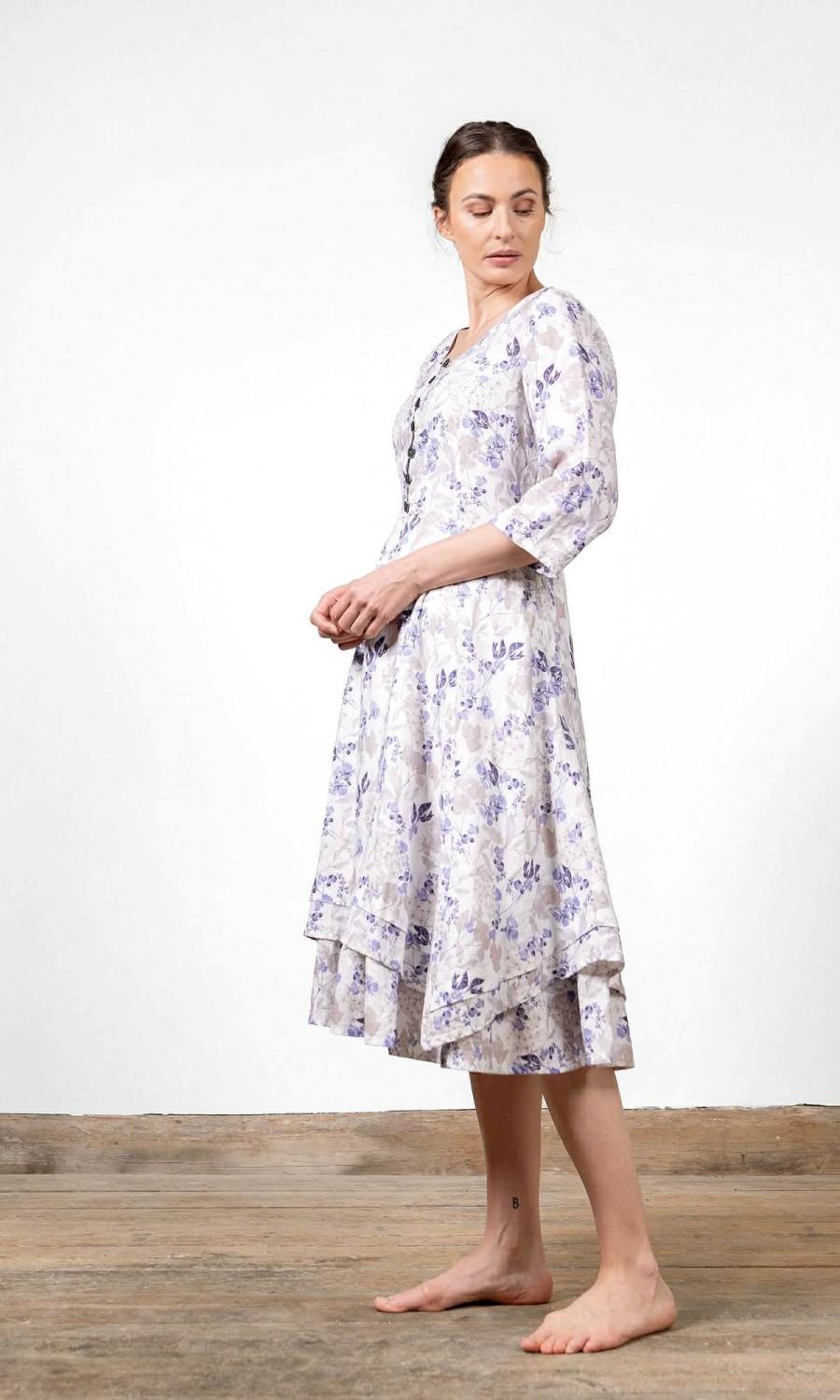 Formsydd modell med dekorative knapper ved bysten og velarbeidet rysjer nederst. Trekvartlange ermer og rund hals. Skjulte lommer i silken.