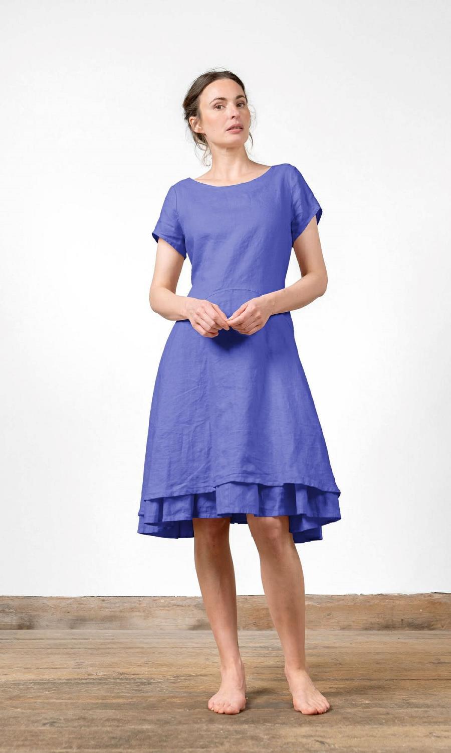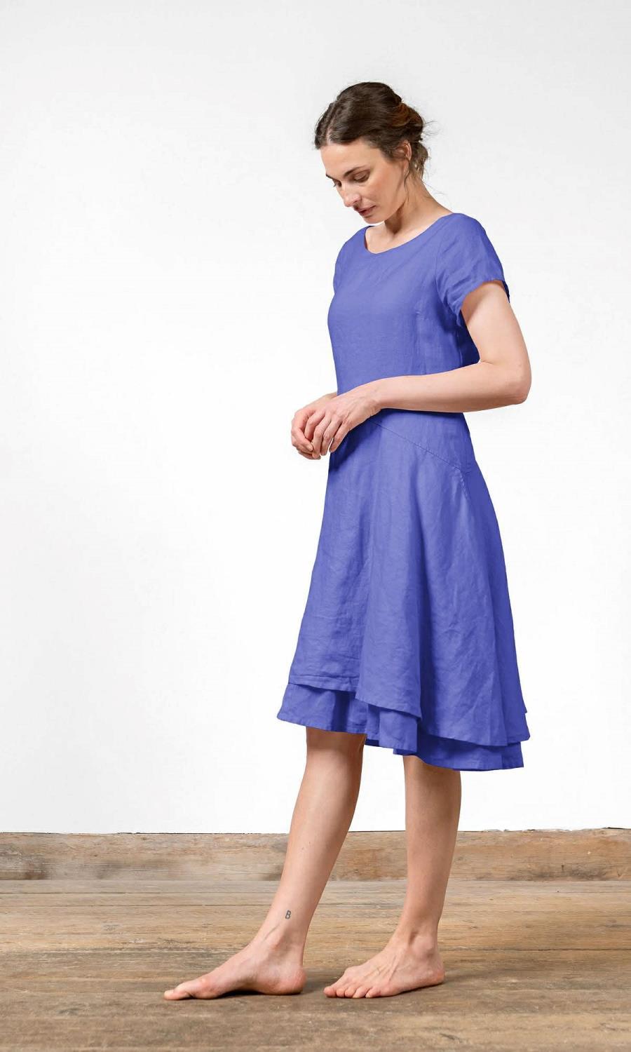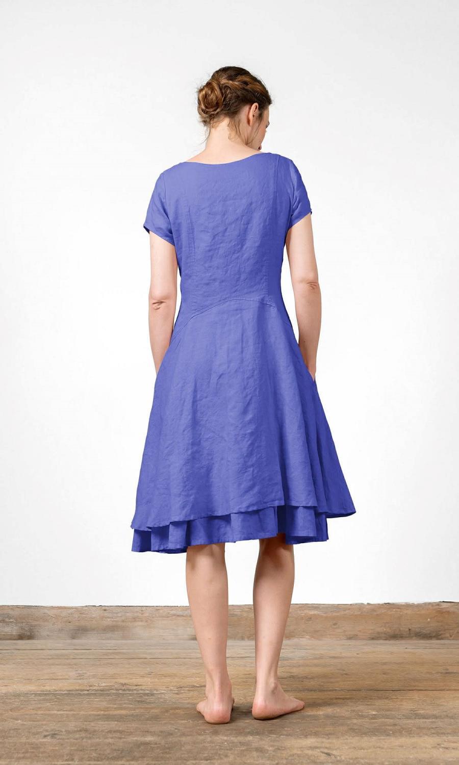 Denne yndige lin-kjolen har rund hals og korte ermer. Pent innsvinget liv og to lag luksus i skjørtedelen. To skjulte lommer.