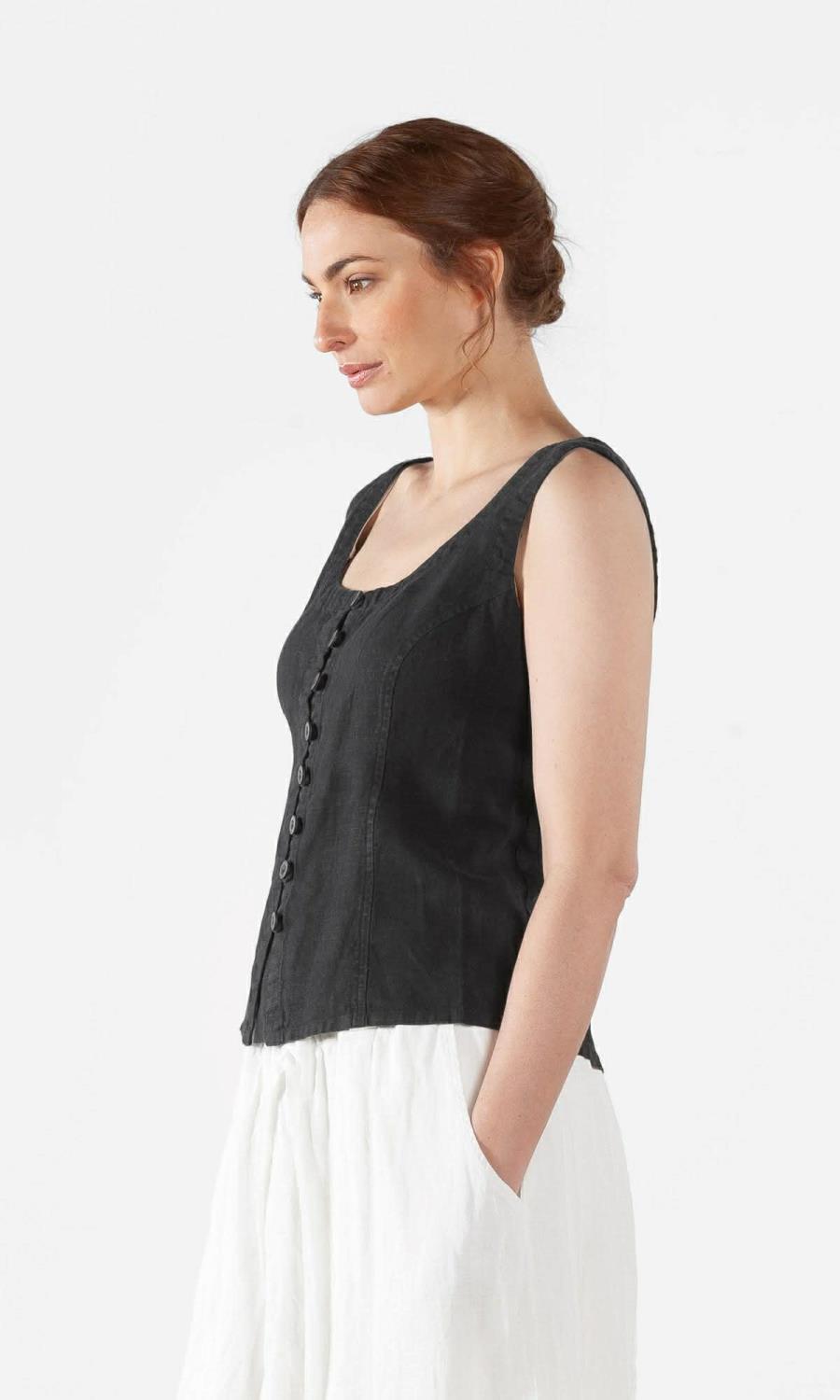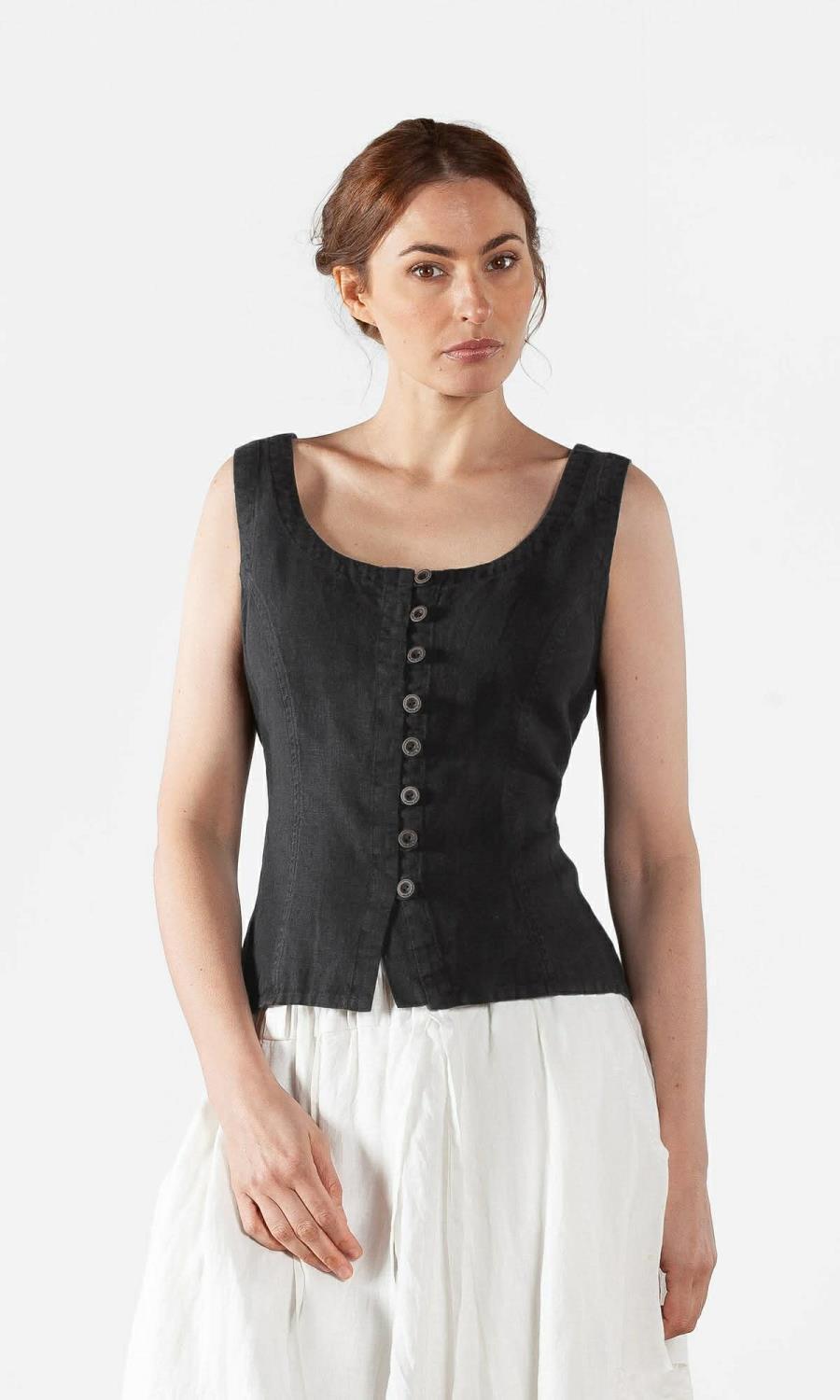 Vakkert linplagg med knapper foran og rund hals. Smigrende knyting bak. Lett innsvinget liv. Laget i Europa.