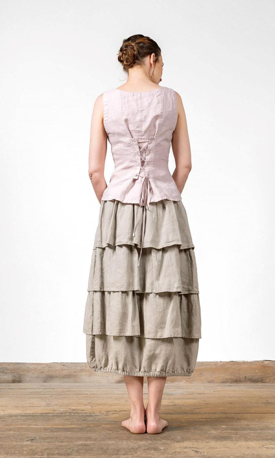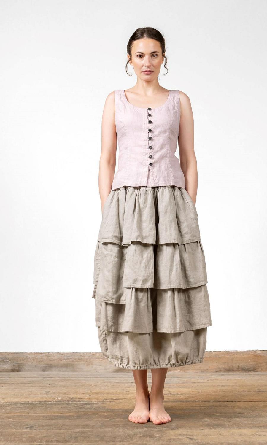 Et mykt, voluminøst linkjørt med flere lag som skaper et levende og organisk uttrykk. Stoffet er vasket og har en naturlig struktur som gjør at hver bølge faller på sin egen, avslappede måte. Den elastiske kanten nederst gir en rundet, harmonisk form som beveger seg smidig rundt bena. Et plagg som føles lekent, kunstnerisk og samtidig behagelig å bære.