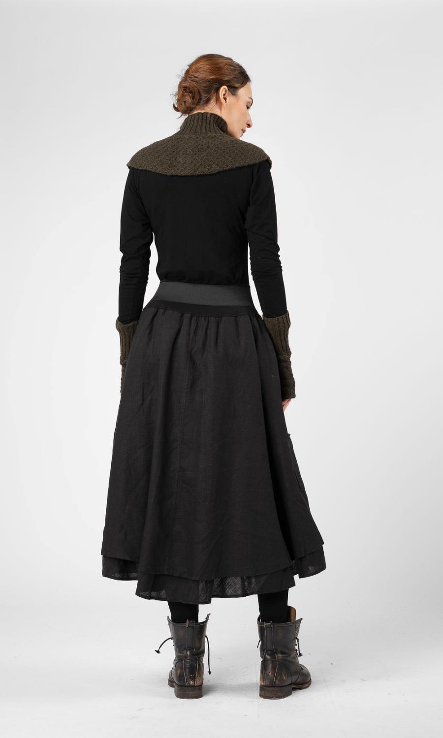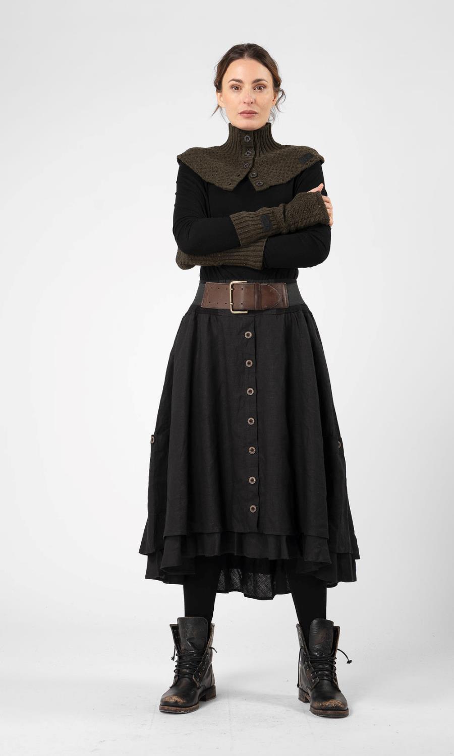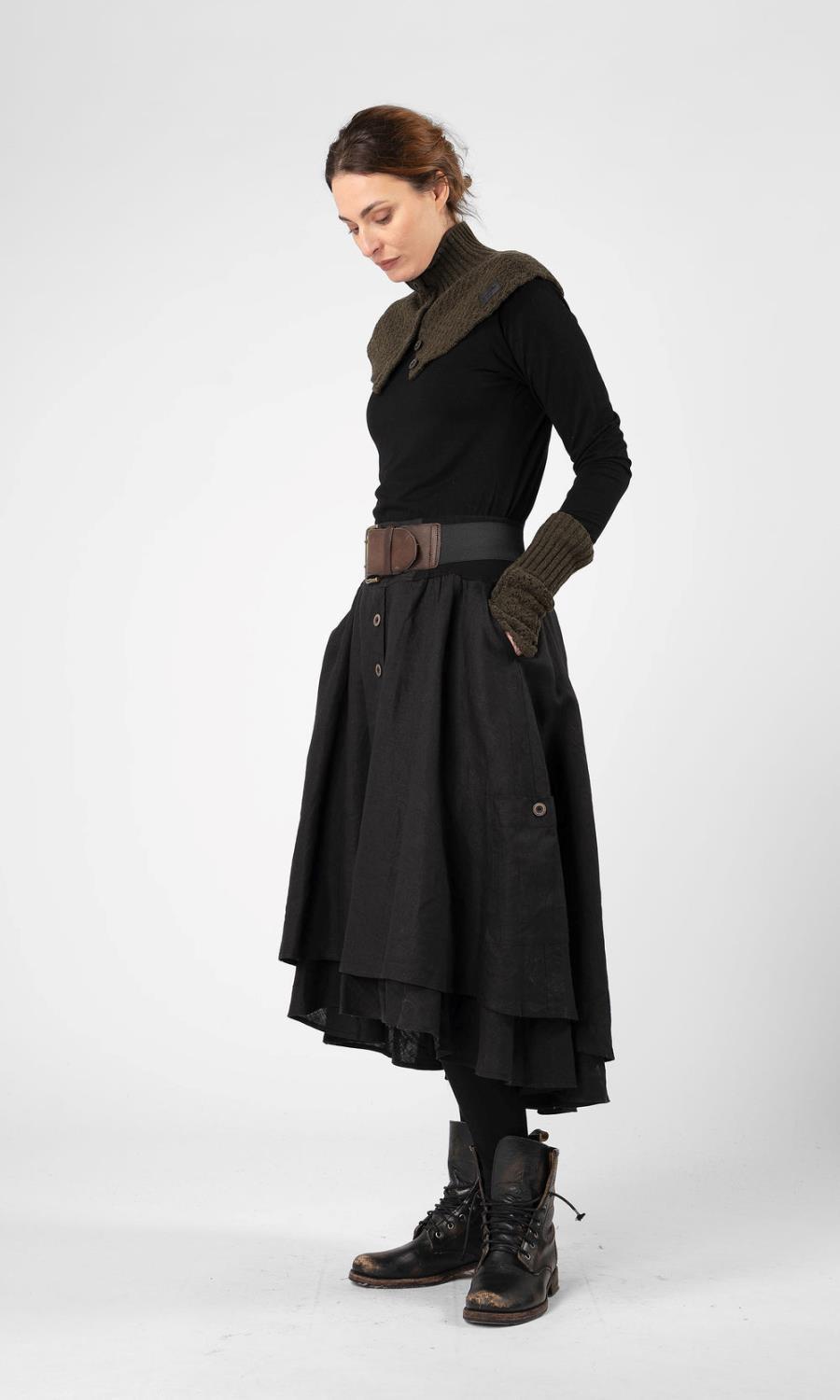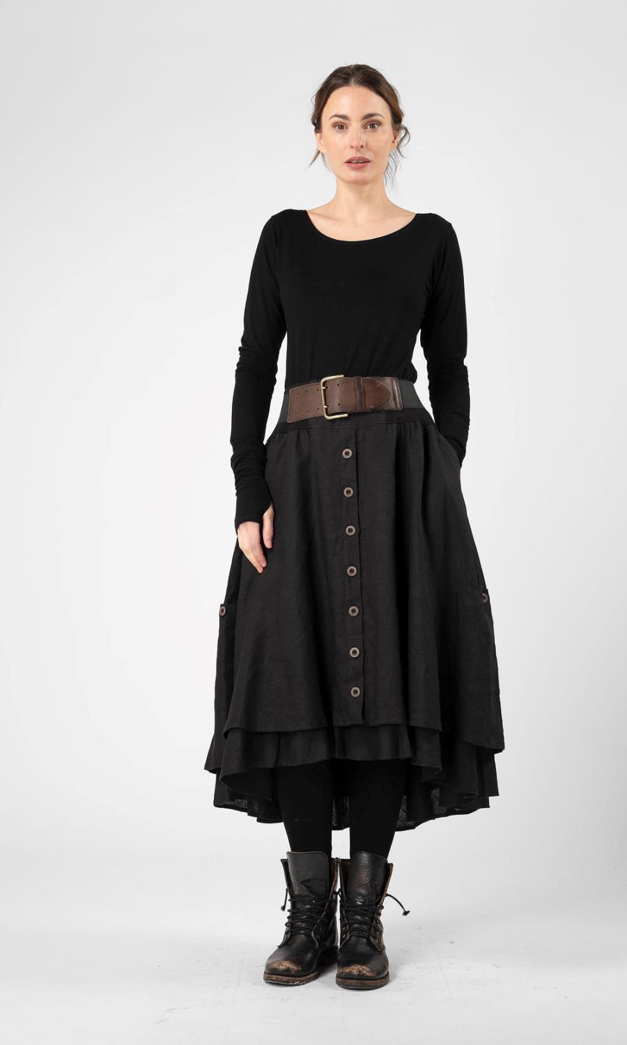 Vi får ikke nok av Noka. Nydelig, vidt langt skjørt i lag. Dekorativ knepping foran og matchende utvendige lommer med knapp. Ekstra skjulte lommer i sidene og en komfortabel elastisk midje.