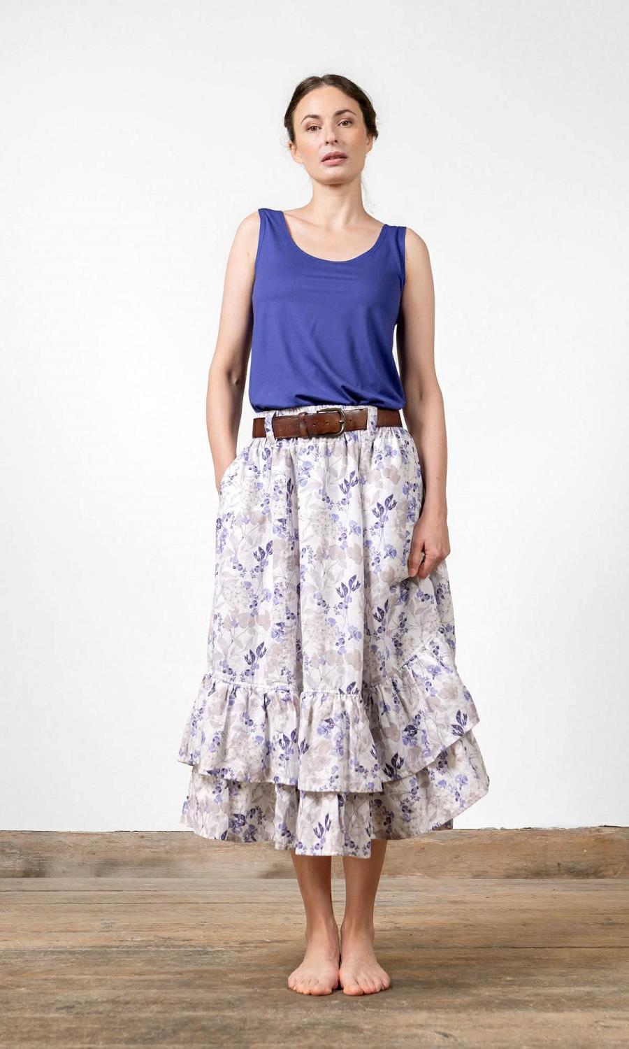 Klassisk lang skjørt med et naturlig, vakkert fall i blått blomstret linstoff. Doble volanger, skjulte lommer i siden og elastikk i midjen.