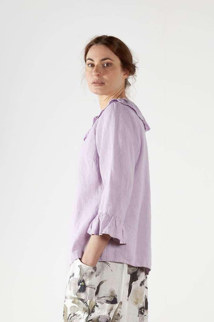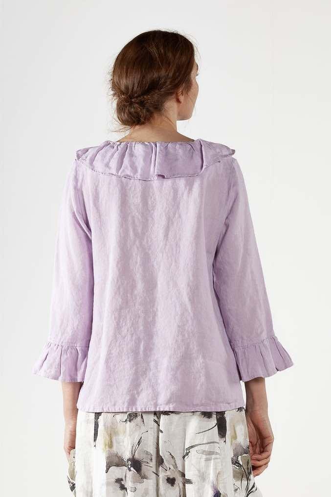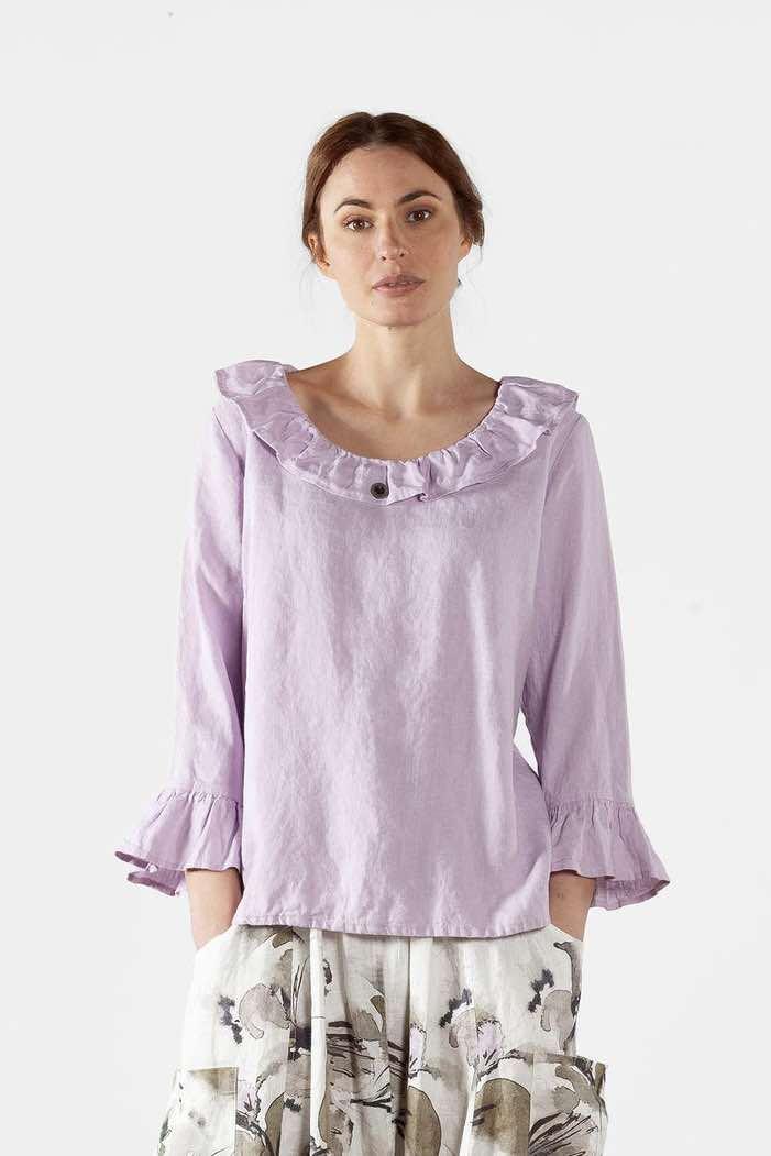 Tafs er en lekker lintopp i rett avslappet stil. Rund vid hals med volang rundt halskanten og på ermene.