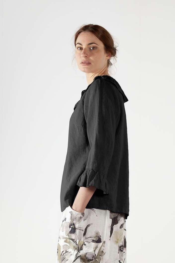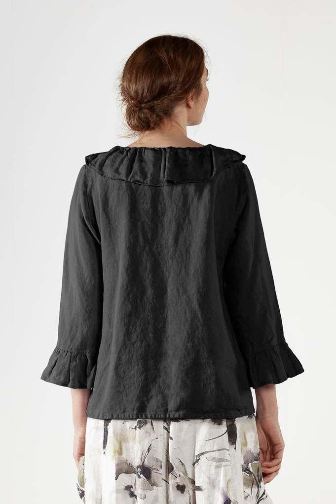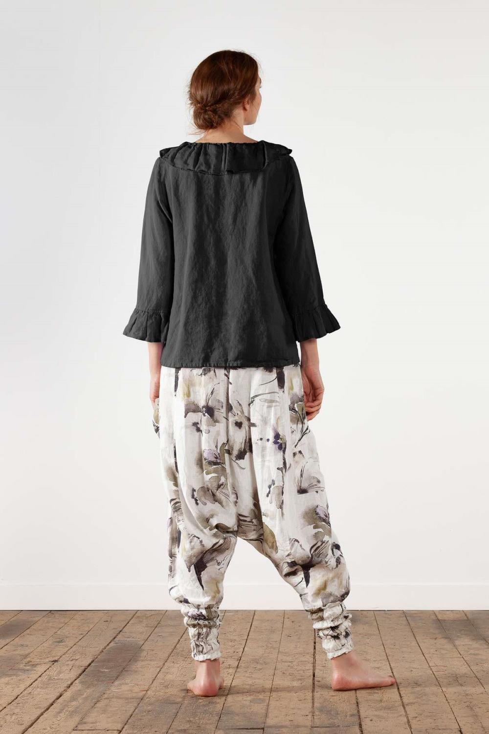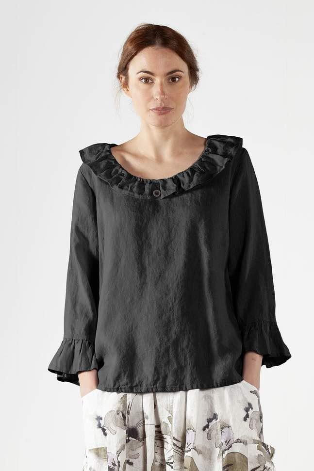 Tafs er en lekker lintopp i rett avslappet stil. Rund vid hals med volang rundt halskanten og på ermene.