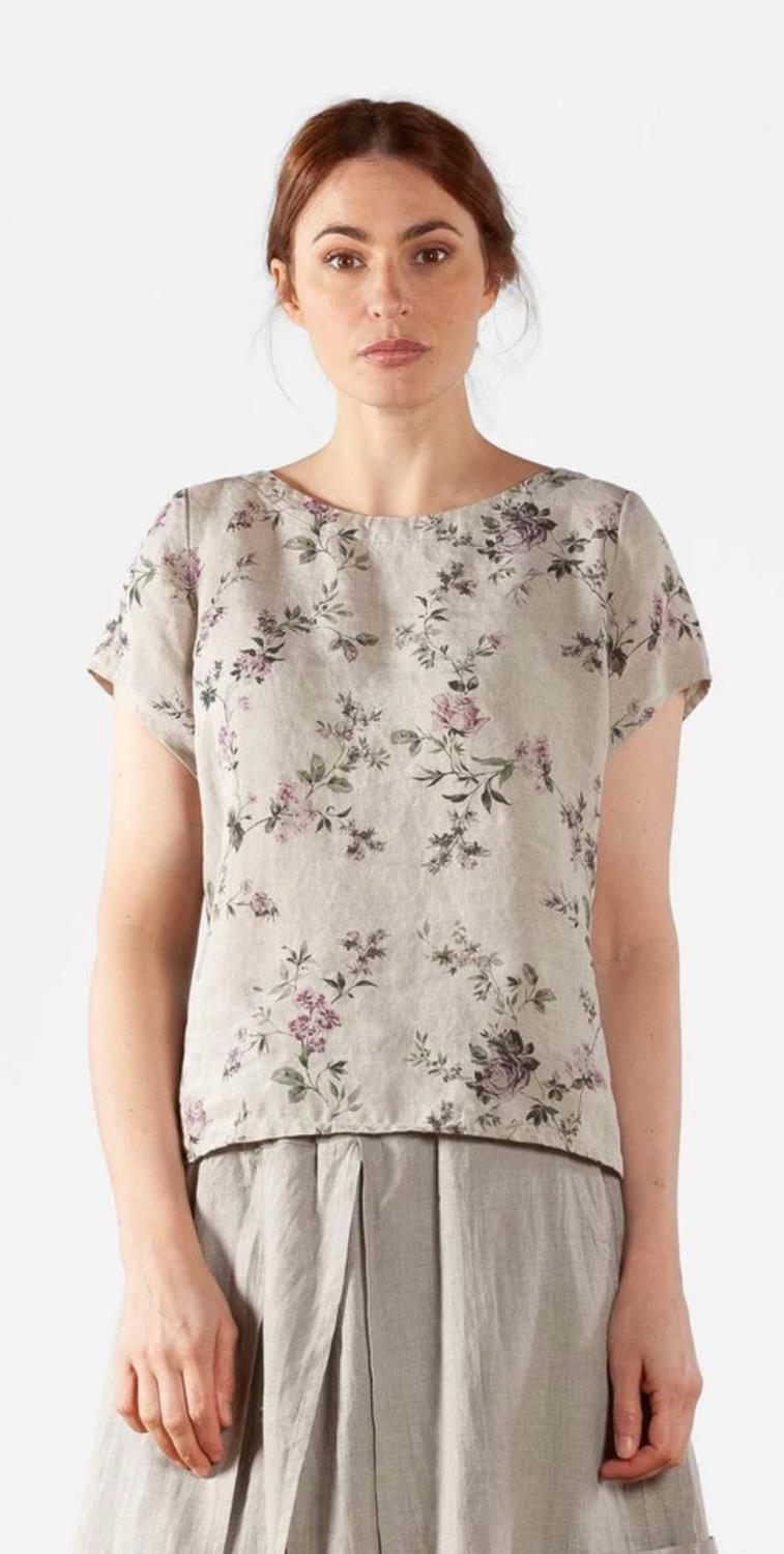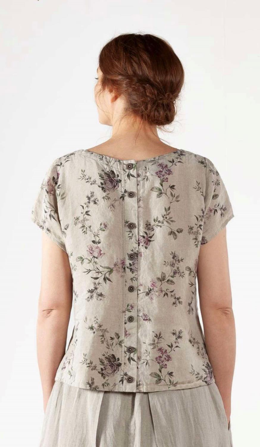 Trona er en lekker midjelang lintopp i klassisk stil. Rund hals med knapperekke i ryggen. Rett i snittet og korte ermer.