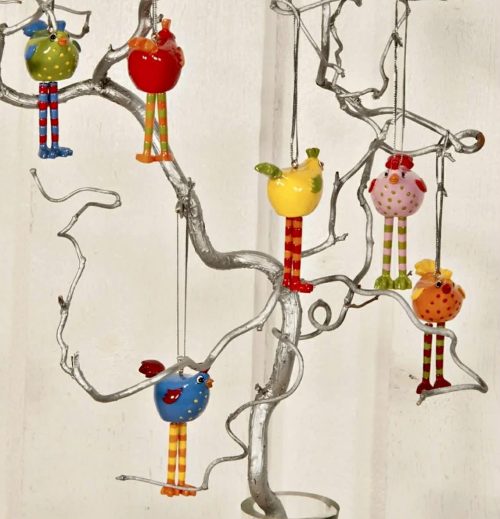 6 stk små minihøner med flaksende ben. Blank overflate og glade sterke farger. Kjempesøte og fine og ha hengende på en kvist.