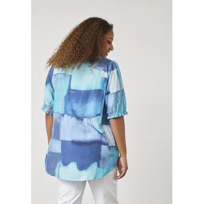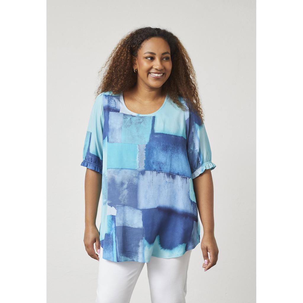 En lett og luftig bluse med feminine detaljer og en avslappet passform. Den rynkede halsen og de korte ermene skaper et mykt, feminint uttrykk, mens det A-formede snittet sikrer en vakker og behagelig silhuett. Det lette stoffet føles behagelig mot huden, noe som gjør det ideelt for dager varme eller lagdelt styling.