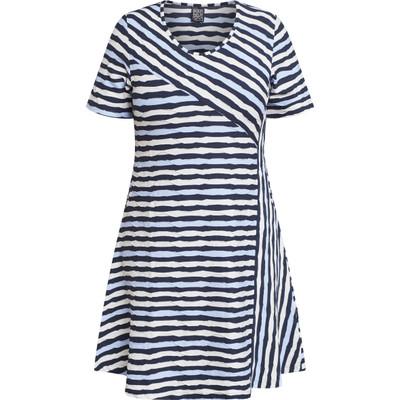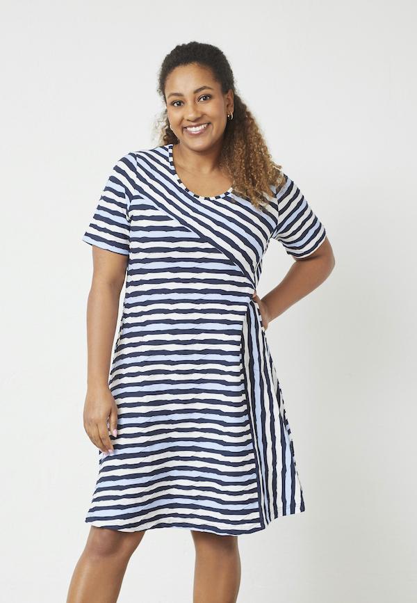 En feminin og allsidig kjole med et stilig stripet mønster og en flatterende passform i A-form. Den lette og elastiske viskoseblandingen føles myk og behagelig, mens den asymmetriske halsen gir en elegant touch.
