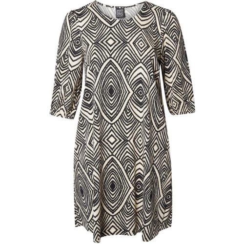 Denne mønstrede kjolen er både stilig og komfortabel. Med sin luftige A-form og elastiske materiale gir den en flatterende passform som beveger seg med kroppen din. Det geometriske mønsteret gir et moderne preg, mens trekvart ermer gjør den ideell for overgangssesongene.