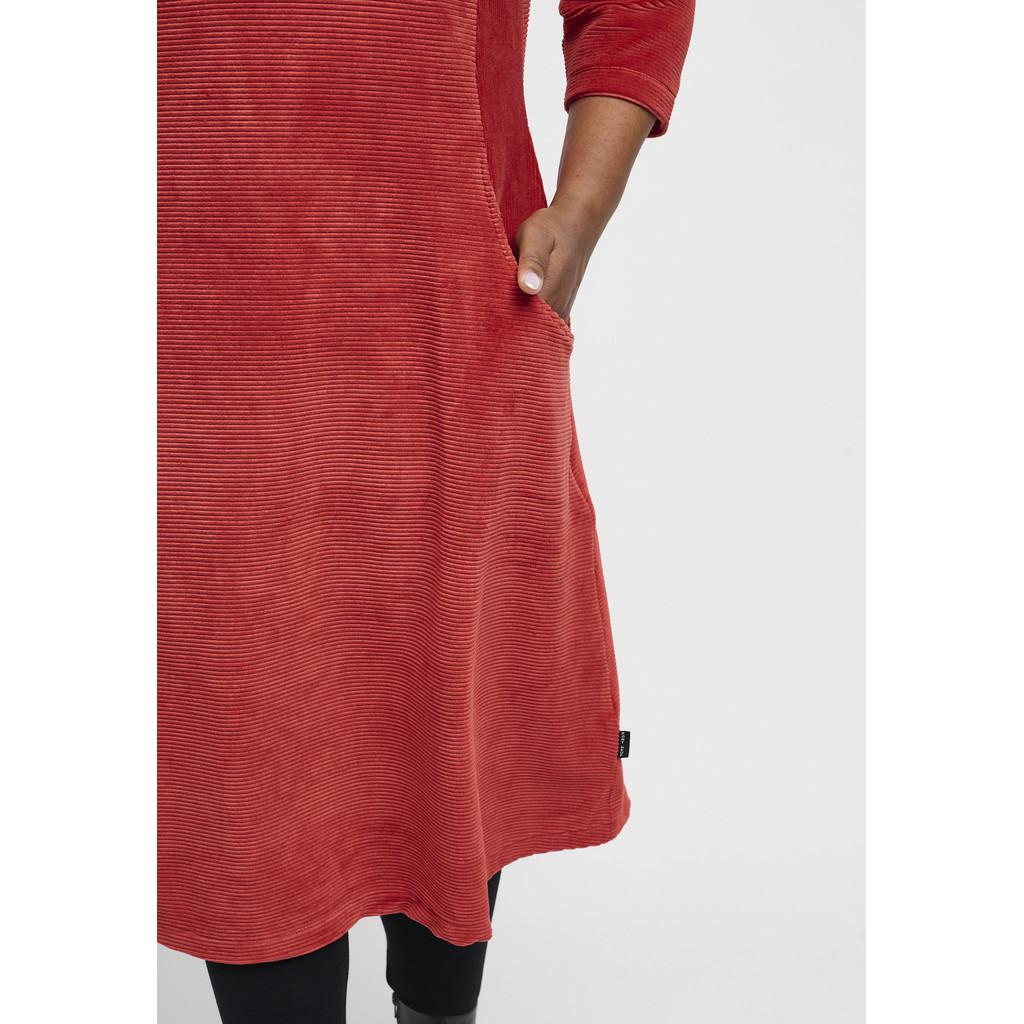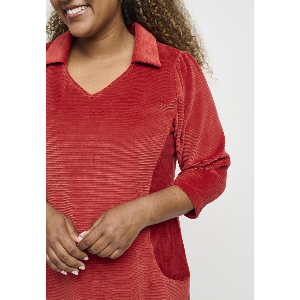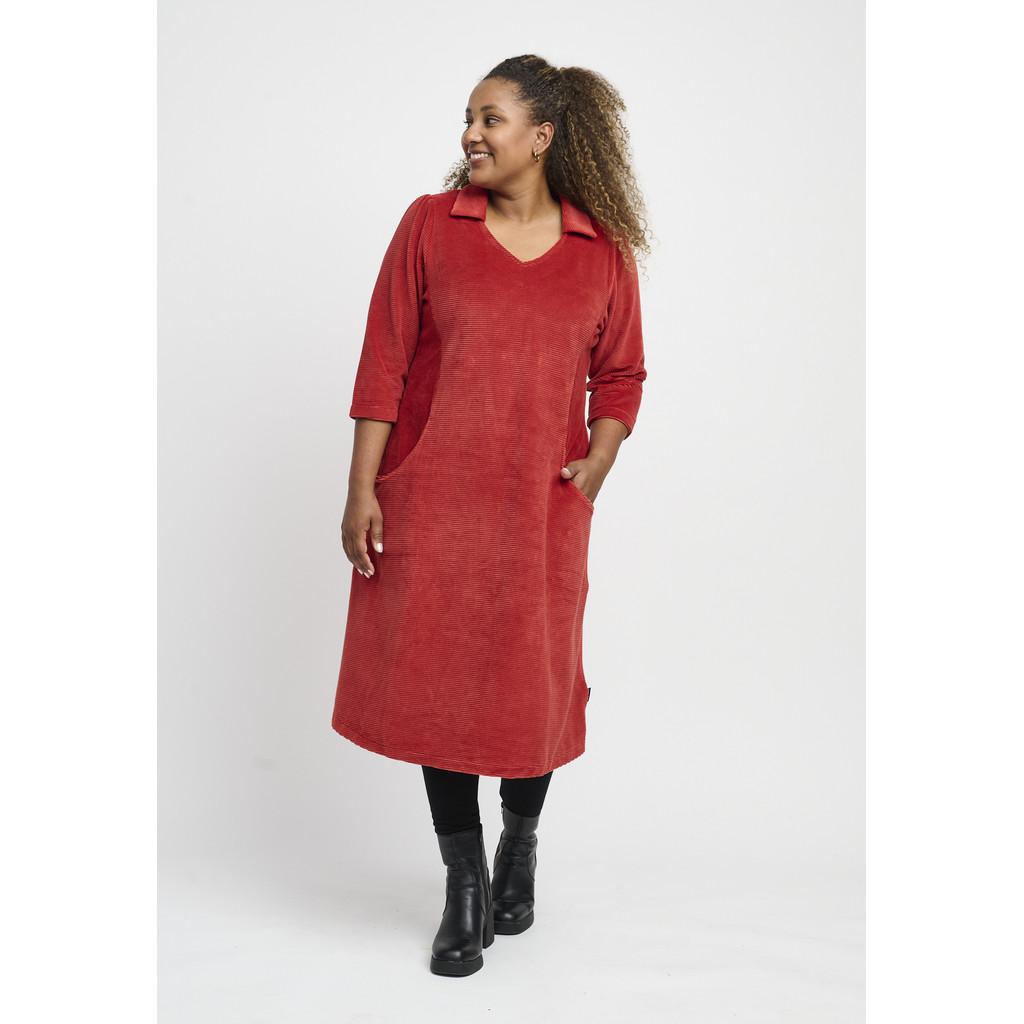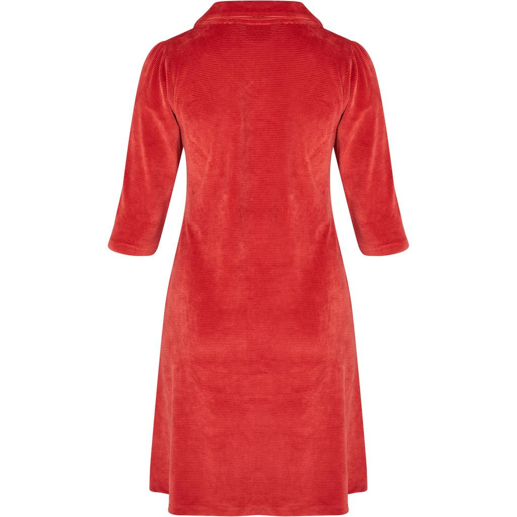 Lekker midikjole med V-hals, skjortekrage og ¾-lange ermer. Den har sidelommer og en ensfarget design i myk velurcord. Kjolen er laget av en deilig stretchbomullsblanding og har en A-formet passform.