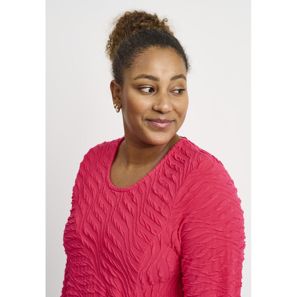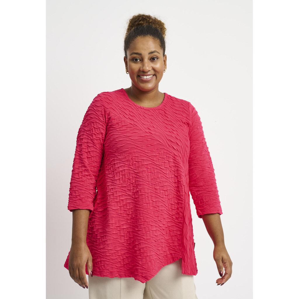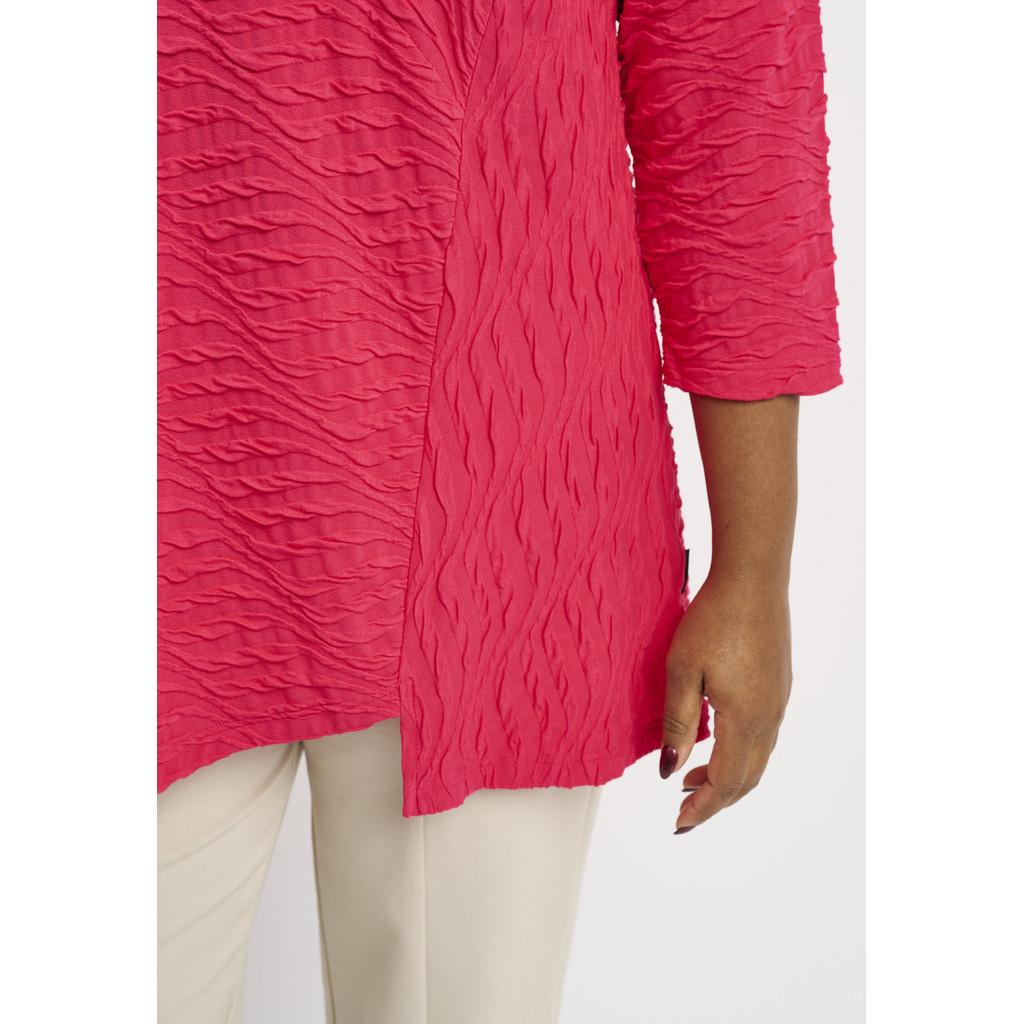 Denne toppen i A-form er designet med komfort og stil i tankene. Det lette og elastiske materialet sikrer en behagelig passform, mens det subtile mønsteret og trekvart ermene gjør den ideell for både hverdagsbruk og spesielle anledninger.