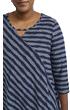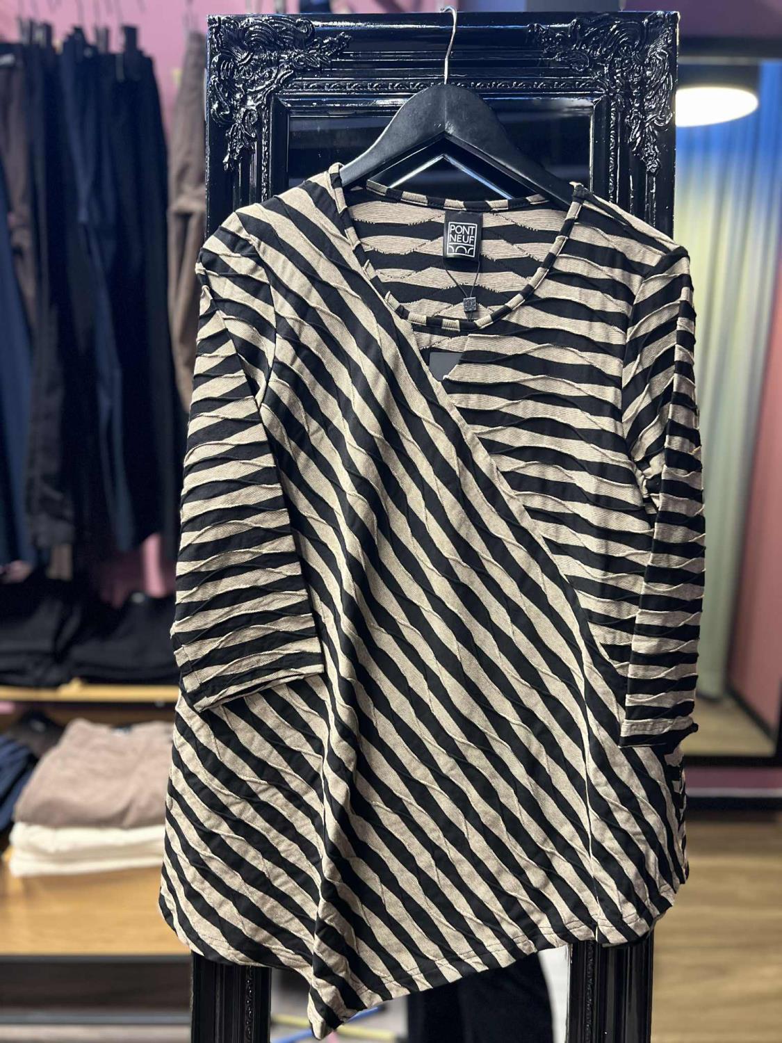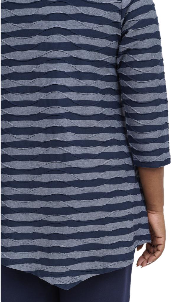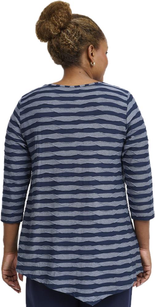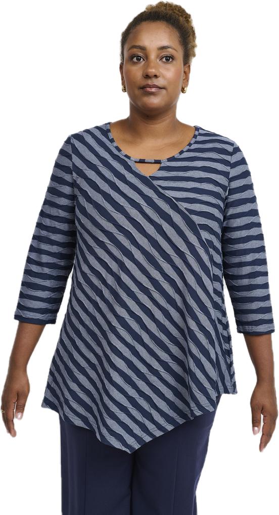Denne vakre tunikaen fra Pont Neuf kombinerer stil og komfort perfekt. Blusen har et unikt diagonalt stripemønster som gir et moderne preg til antrekket ditt. Den A-formede passformen sikrer en flatterende silhuett og gir bevegelsesfrihet. De myke, strikkbare materialene gjør blusen behagelig å ha på hele dagen. Med trekvartslanger og rund hals, er denne blusen ideell for både hverdagsbruk og uformelle anledninger.Styling den med jeans og flate sko gir et avslappet, men stilig utseende.Stilen kalles Magrethe og er laget av 92% viskose og 8% elastan. Passformen er ‘A-Shape’, og den er 76 cm lang bak.