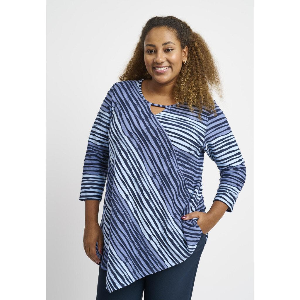 Vakker tunika med 3/4-lange ermer og en unik utringning. Den har et asymmetrisk design og et kult, stripet trykk i de flotte blåfarger. Blusen er laget i en lekker viskosekvalitet med stretch, og den har en A-formet passform.