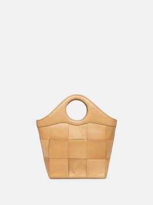 Liten hardcase som håndveske med elegant håndflettet design og sirkulære håndtak.
