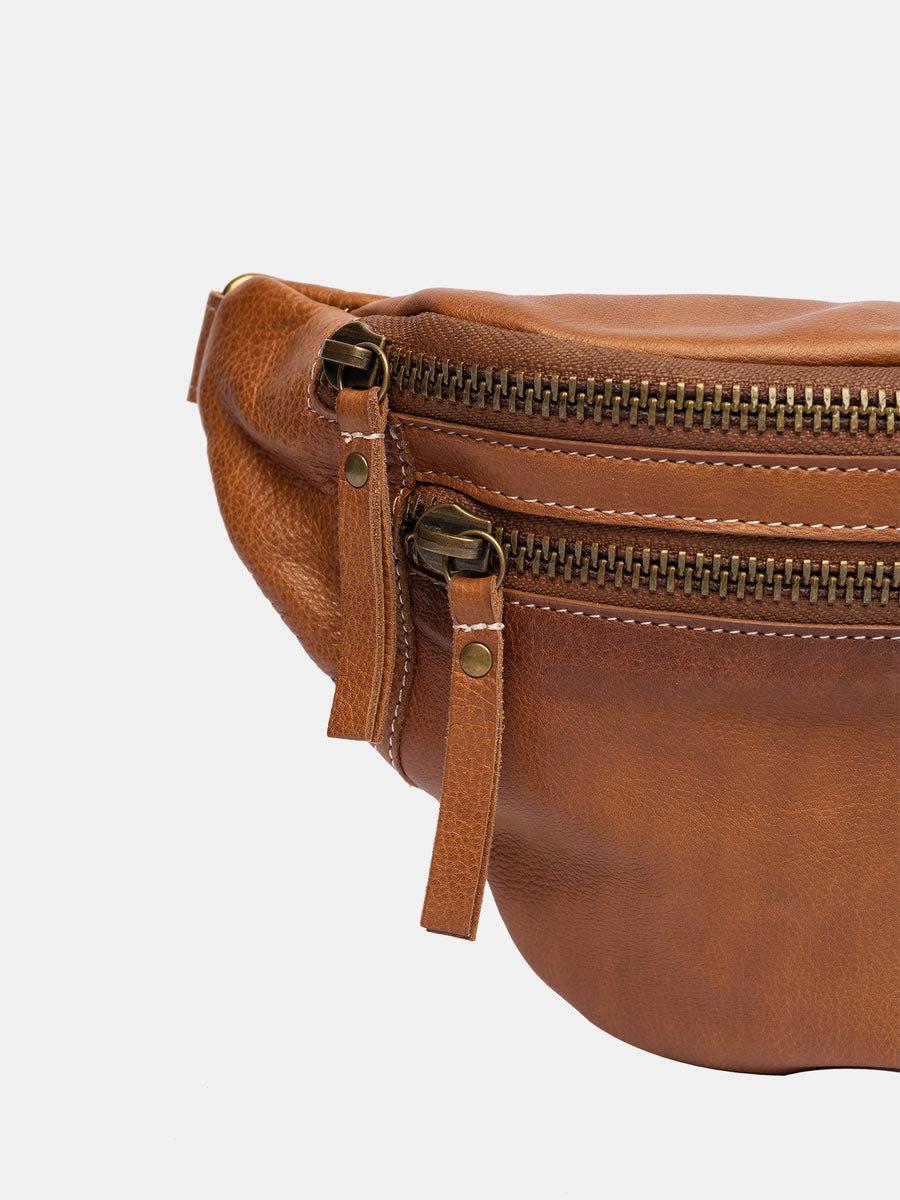 Ellie bumbag er laget av mykt vintage-skinn. Det er 2 hovedlommer som du får tilgang til foran. Lommene lukkes med 8 mm metallglidelåser og alle sømmer er laget med kontrastfargesøm. Stroppen kan justeres.