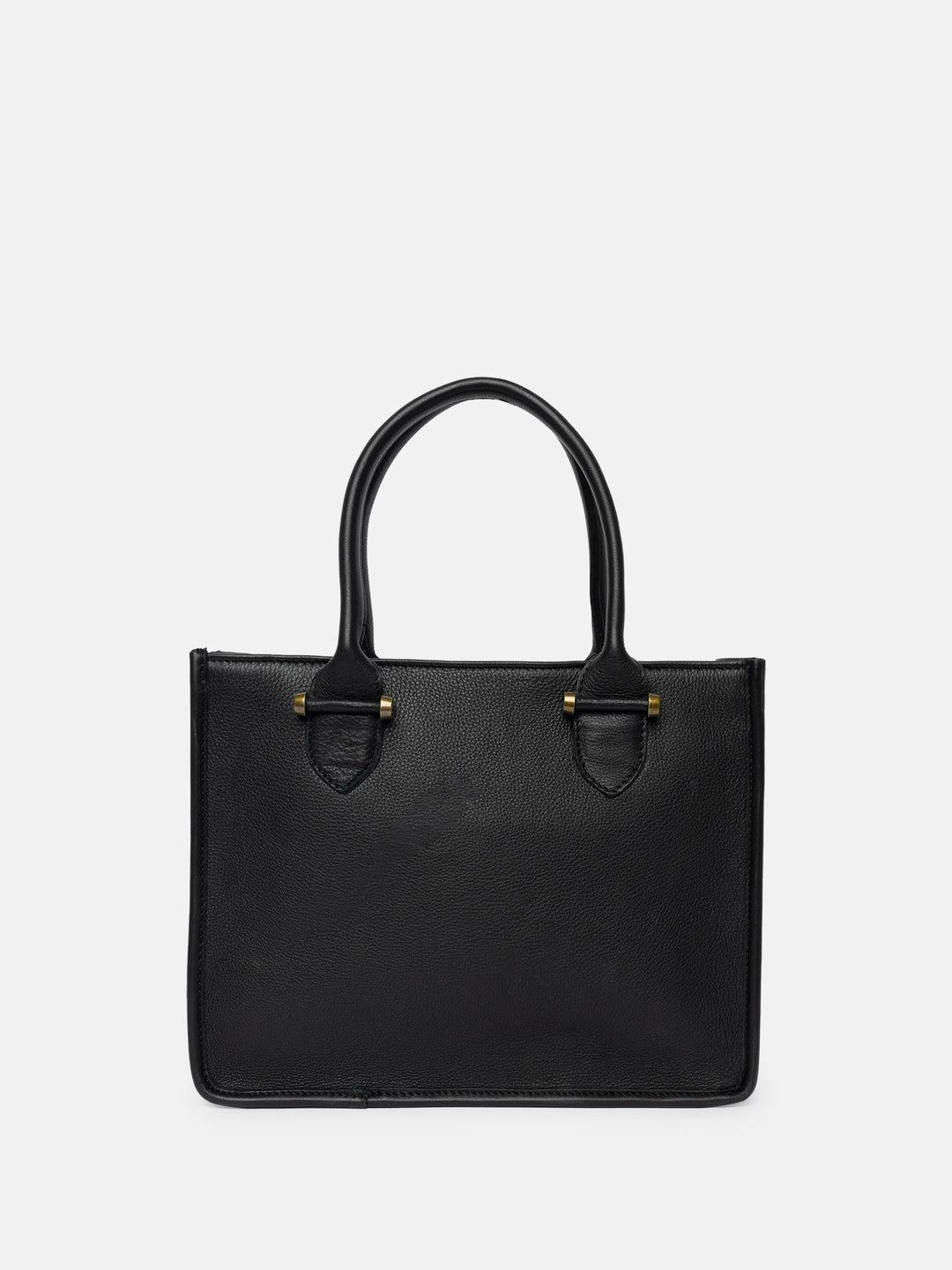 Medium håndveske i hardt etui-design med en kul retro-stemning. Glidelåslukket hovedrom med to mindre lommer i innvendig fôr. Denne klassiske vesken er stor nok til å holde telefonen, nøklene, kortholderen, notatboken og andre nødvendigheter. Messingdetaljer ved de korte håndtakene som gir vesken et elegant utseende. Avtagbar og justerbar crossover stropp.