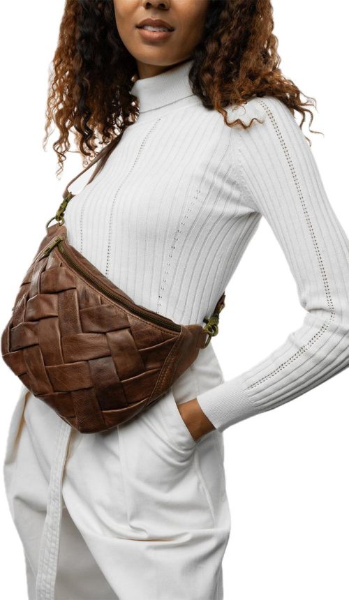 Havana bumbag er en mellomstor skinnveske med ripe antikk messing metallbeslag, glidelåslukking og tykke flettede frontdetaljer. To ekstra lommer i hovedrommet for ekstra funksjonalitet.