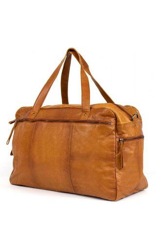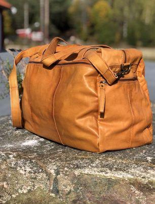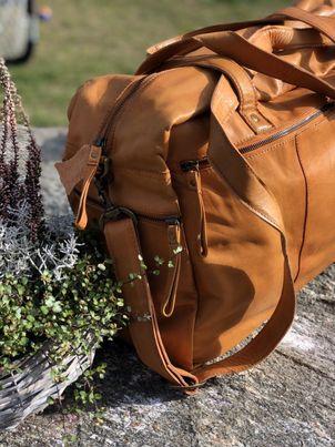 Tidløs stor helgeveske med topp glidelåslukking, skulderhåndtak og lang justerbar/avtagbar stropp. Interiøret har en liten glidelåslomme og to åpne lommer. Ekstra glidelåslommer foran og på enden gir ekstra lagringsplass. Skinnet utvikler en vakker patina over tid, noe som sikrer et unikt utseende.