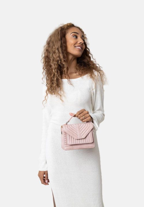 Liten crossbody i flott design fra Re:Designed By Dixie. Vesken har frontlomme med klaff, quiltmønster og magnetlukking. Innholdsrik på innsiden med flere lommer og glidelåsrom. Avtakbar og justerbar crossover-reim for personlig passform, og et lite håndtak øverst på vesken.