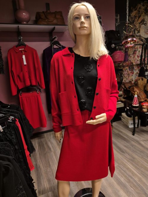 Stilig cardigan i en lekker rød farge som ser ut som en liten blazer cardigan. Lekre knapper og to lommer i front.