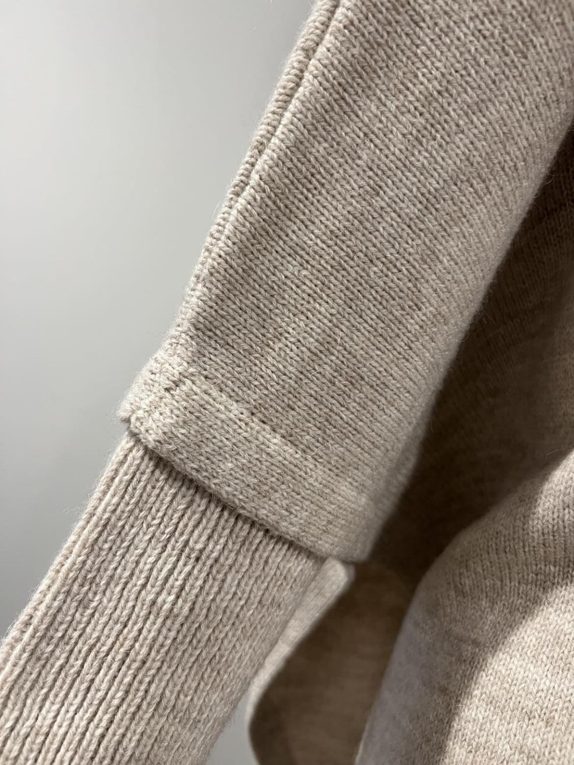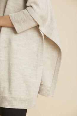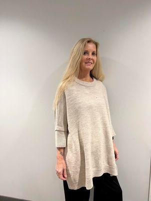 Lekker poncho m/ rund hals, drop down skuldre. 2/3 ermer, splitt i sidene. Ribbekant rundt hals, armer og nederst.